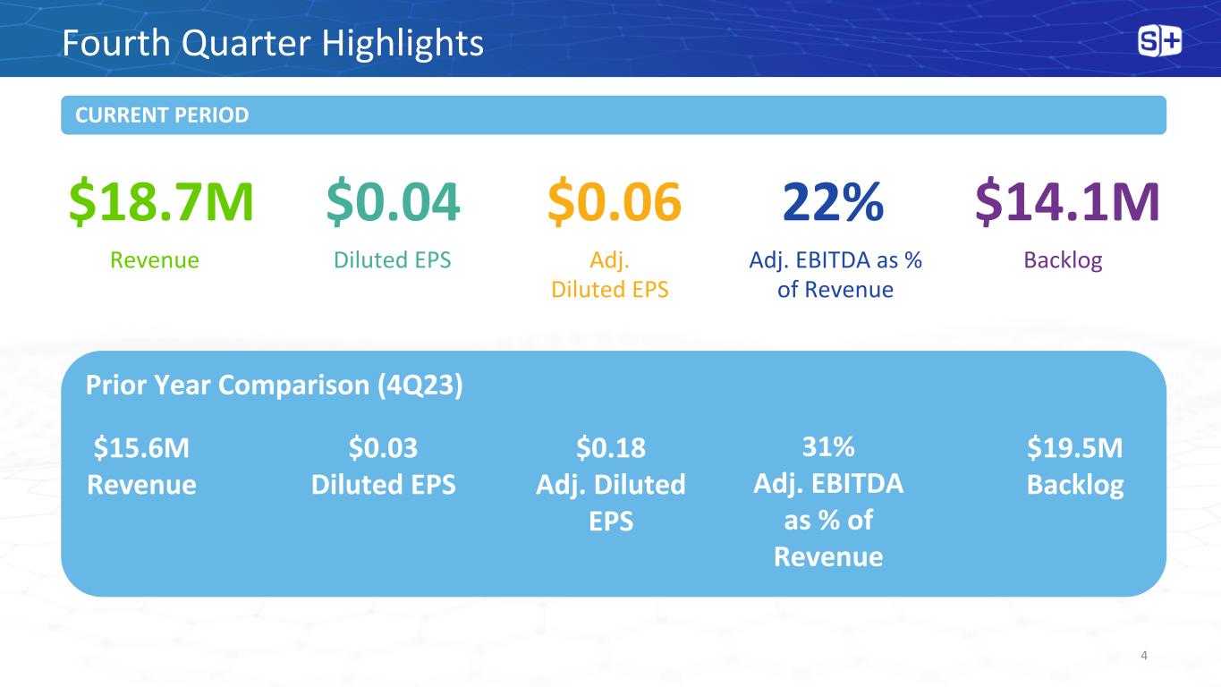 Full Year 2024 Highlights $0.49 Diluted EPS $70.0M Revenue 29% Adj. EBITDA as % of Revenue $14.1M Backlog 3 CURRENT PERIOD Prior Year Comparison (FY23) $59.6M Revenue $0.49 Diluted EPS 35% Adj. EBITDA as % of Revenue $19.5M Backlog $0.53 Adj. Diluted EPS $0.67 Adj. Diluted EPS