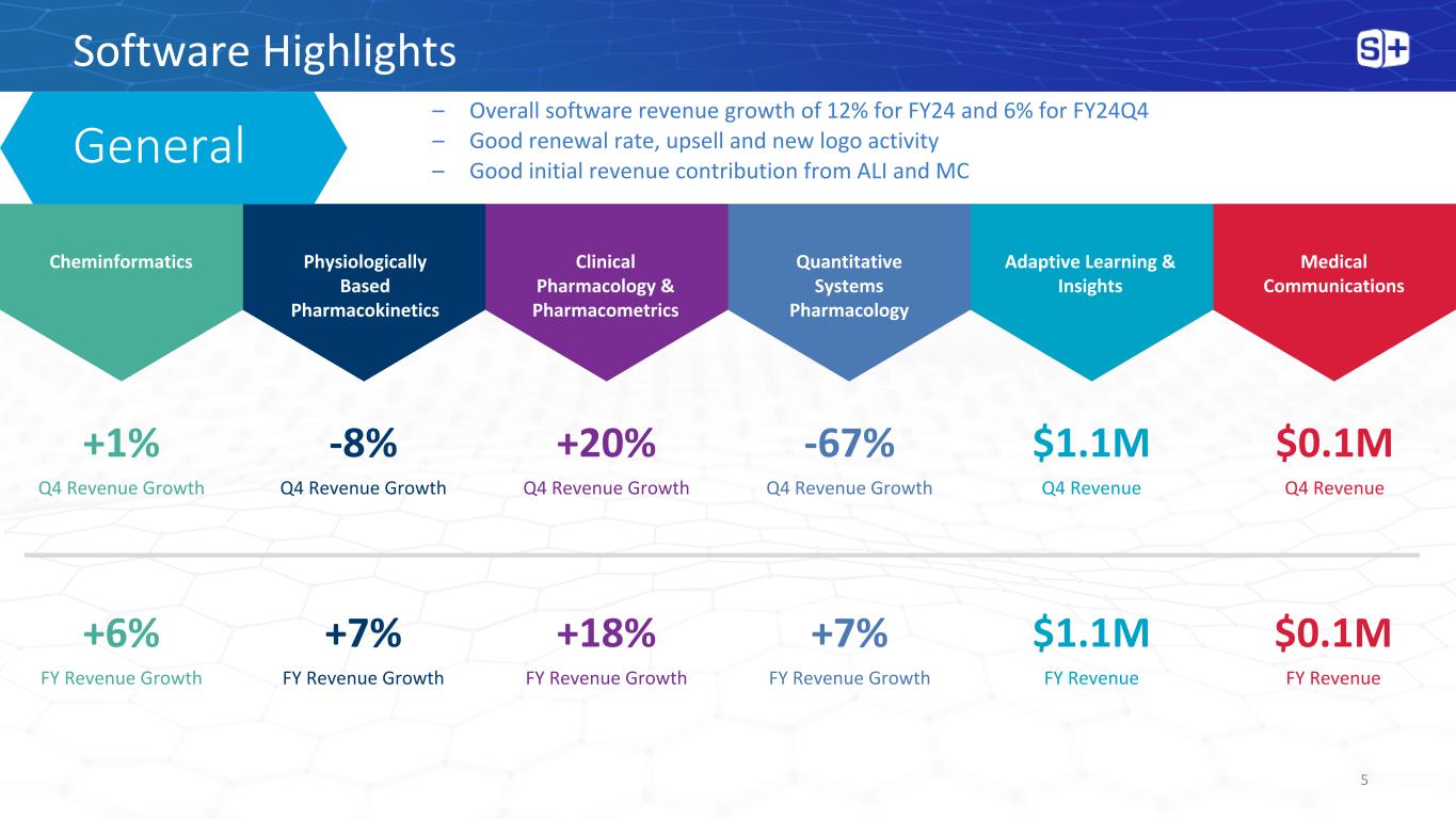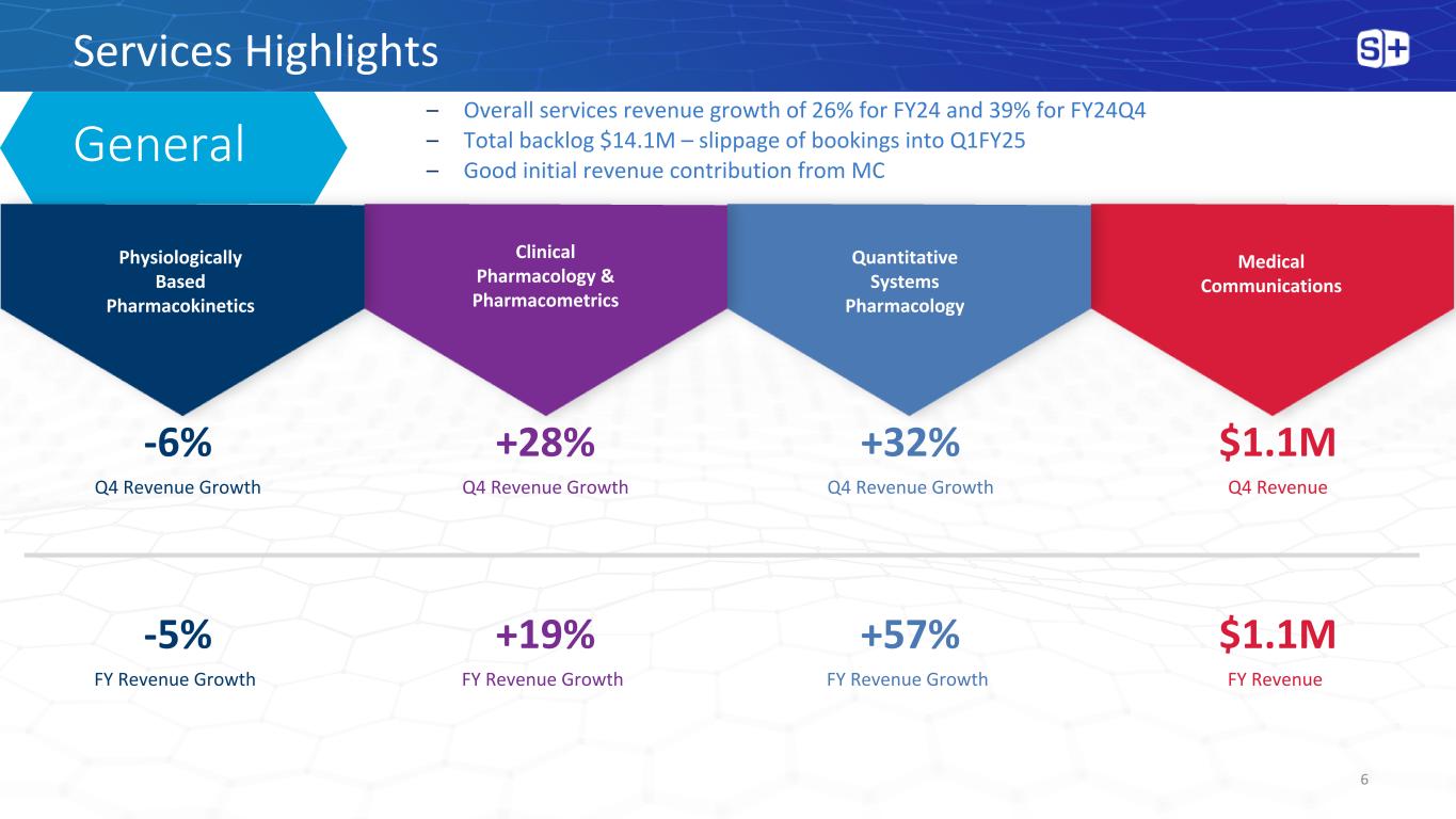 – Overall software revenue growth of 12% for FY24 and 6% for FY24Q4 – Good renewal rate, upsell and new logo activity – Good initial revenue contribution from ALI and MC Software Highlights +1% Q4 Revenue Growth General -8% Q4 Revenue Growth +20% Q4 Revenue Growth -67% Q4 Revenue Growth $1.1M Q4 Revenue $0.1M Q4 Revenue +6% FY Revenue Growth +7% FY Revenue Growth +18% FY Revenue Growth +7% FY Revenue Growth $1.1M FY Revenue $0.1M FY Revenue 5 Cheminformatics Physiologically Based Pharmacokinetics Clinical Pharmacology & Pharmacometrics Quantitative Systems Pharmacology Adaptive Learning & Insights Medical Communications