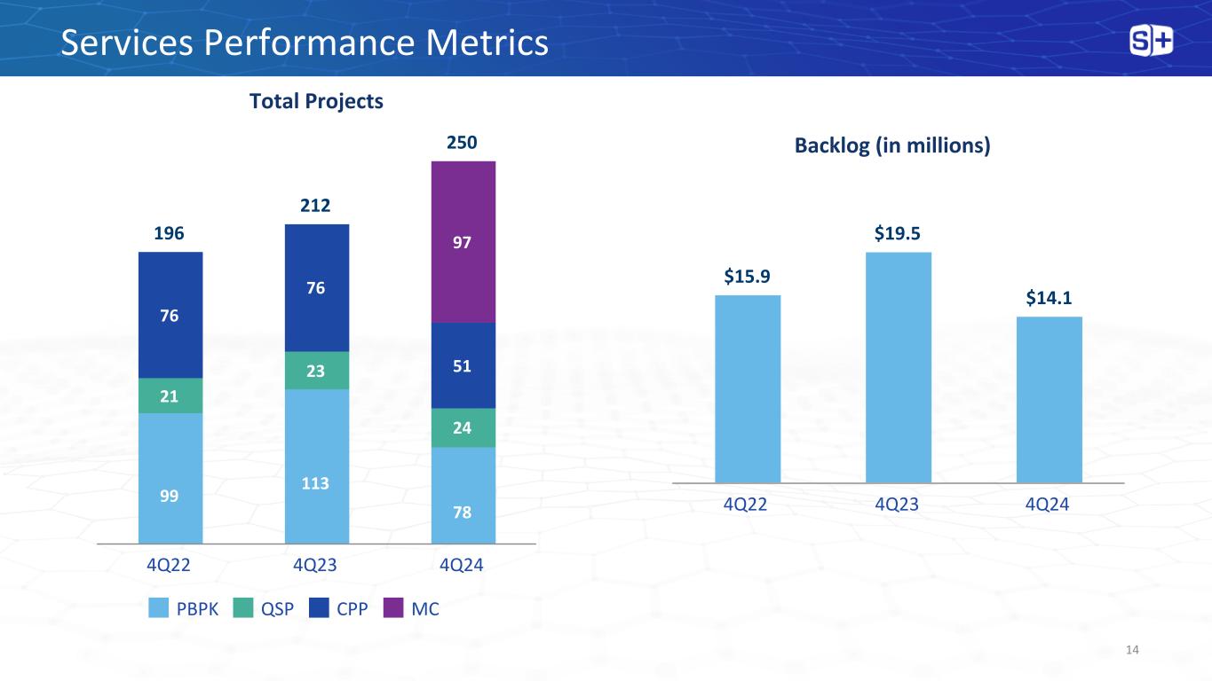 $15.9 $19.5 $14.1 4Q22 4Q23 4Q2499 113 78 21 23 24 76 76 51 97196 212 250 PBPK QSP CPP MC 4Q22 4Q23 4Q24 Services Performance Metrics Total Projects Backlog (in millions) 14
