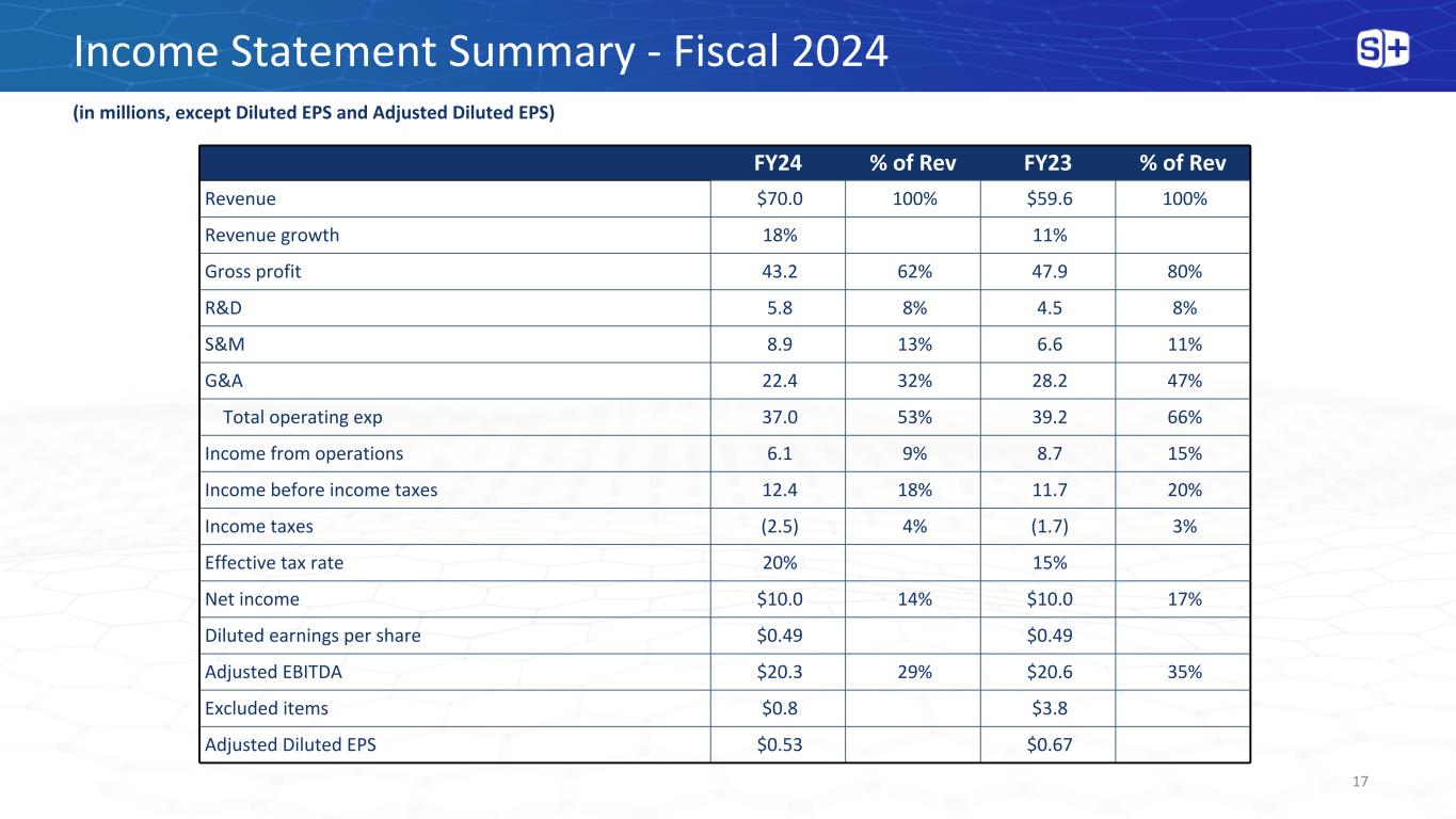 Income Statement Summary - Q4 16 (in millions, except Diluted EPS and Adjusted Diluted EPS) 4Q24 % of Rev 4Q23 % of Rev Revenue $18.7 100% $15.6 100% Revenue growth 19% 33% Gross profit 6.8 37% 12.3 78% R&D 1.9 10% 1.1 7% S&M 2.6 14% 1.7 11% G&A 3.5 19% 9.8 63% Total operating exp 8.0 43% 12.5 80% Loss from operations (1.2) (6)% (0.3) (2)% Income before income taxes 0.9 5% 0.1 —% Income taxes — —% 0.5 3% Effective tax rate 2% 674% Net income $0.8 5% $0.5 3% Diluted earnings per share $0.04 $0.03 Adjusted EBITDA $4.1 22% $4.9 31% Excluded items $0.3 $3.1 Adjusted Diluted EPS $0.06 $0.18