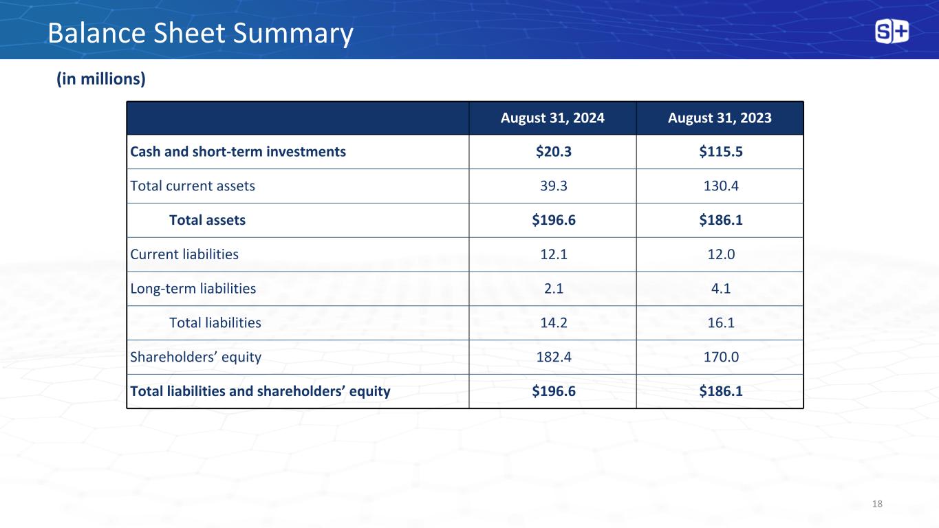 Balance Sheet Summary 18 August 31, 2024 August 31, 2023 Cash and short-term investments $20.3 $115.5 Total current assets 39.3 130.4 Total assets $196.6 $186.1 Current liabilities 12.1 12.0 Long-term liabilities 2.1 4.1 Total liabilities 14.2 16.1 Shareholders’ equity 182.4 170.0 Total liabilities and shareholders’ equity $196.6 $186.1 (in millions)