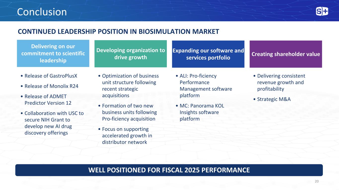 WELL POSITIONED FOR FISCAL 2025 PERFORMANCE Delivering on our commitment to scientific leadership Expanding our software and services portfolio 20 • Release of GastroPlusX • Release of Monolix R24 • Release of ADMET Predictor Version 12 • Collaboration with USC to secure NIH Grant to develop new AI drug discovery offerings Developing organization to drive growth Creating shareholder value CONTINUED LEADERSHIP POSITION IN BIOSIMULATION MARKET Conclusion • Optimization of business unit structure following recent strategic acquisitions • Formation of two new business units following Pro-ficiency acquisition • Focus on supporting accelerated growth in distributor network • ALI: Pro-ficiency Performance Management software platform • MC: Panorama KOL Insights software platform • Delivering consistent revenue growth and profitability • Strategic M&A