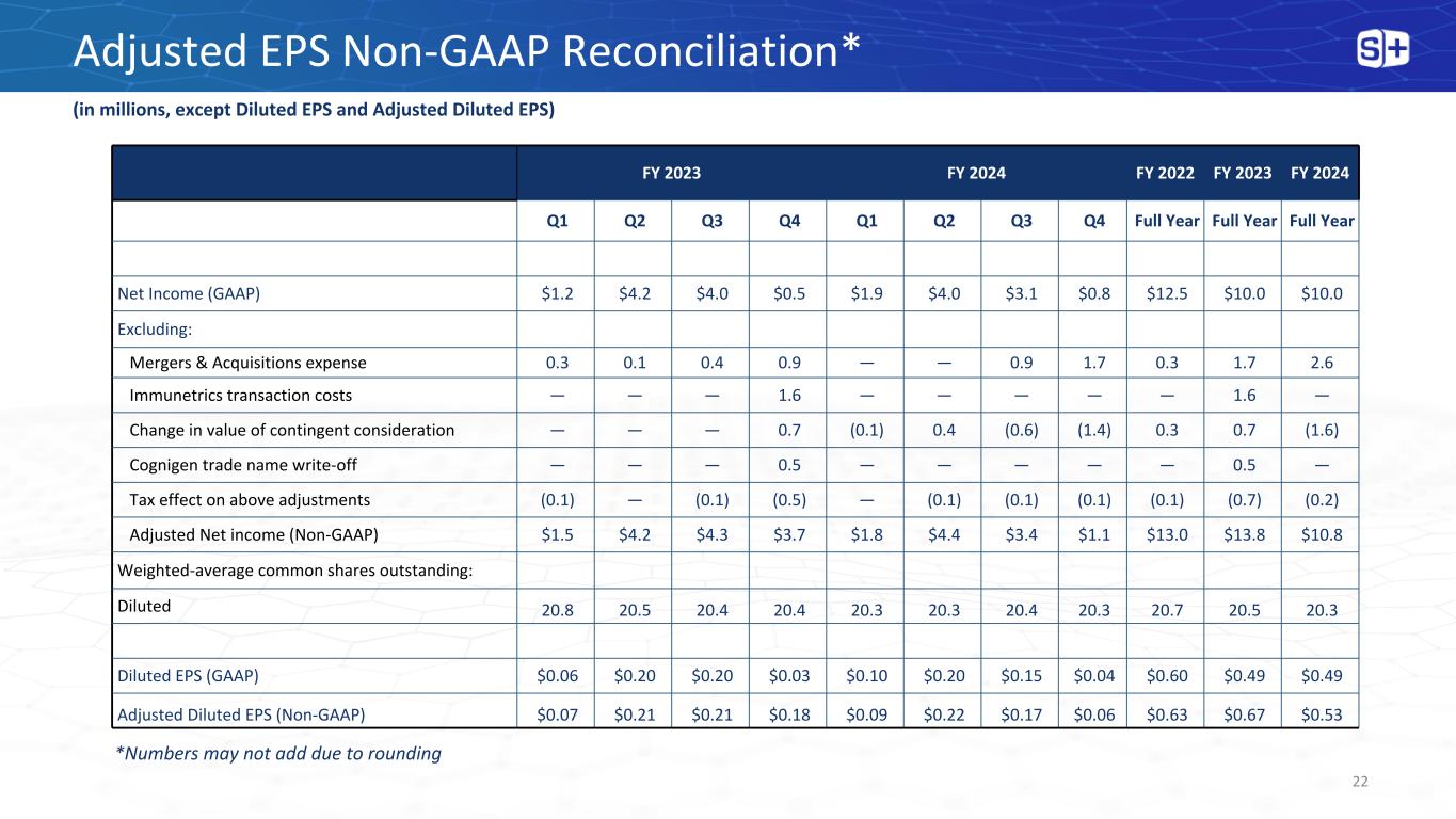 Adjusted EPS Non-GAAP Reconciliation* 22 FY 2023 FY 2024 FY 2022 FY 2023 FY 2024 Q1 Q2 Q3 Q4 Q1 Q2 Q3 Q4 Full Year Full Year Full Year Net Income (GAAP) $1.2 $4.2 $4.0 $0.5 $1.9 $4.0 $3.1 $0.8 $12.5 $10.0 $10.0 Excluding: Mergers & Acquisitions expense 0.3 0.1 0.4 0.9 — — 0.9 1.7 0.3 1.7 2.6 Immunetrics transaction costs — — — 1.6 — — — — — 1.6 — Change in value of contingent consideration — — — 0.7 (0.1) 0.4 (0.6) (1.4) 0.3 0.7 (1.6) Cognigen trade name write-off — — — 0.5 — — — — — 0.5 — Tax effect on above adjustments (0.1) — (0.1) (0.5) — (0.1) (0.1) (0.1) (0.1) (0.7) (0.2) Adjusted Net income (Non-GAAP) $1.5 $4.2 $4.3 $3.7 $1.8 $4.4 $3.4 $1.1 $13.0 $13.8 $10.8 Weighted-average common shares outstanding: Diluted 20.8 20.5 20.4 20.4 20.3 20.3 20.4 20.3 20.7 20.5 20.3 Diluted EPS (GAAP) $0.06 $0.20 $0.20 $0.03 $0.10 $0.20 $0.15 $0.04 $0.60 $0.49 $0.49 Adjusted Diluted EPS (Non-GAAP) $0.07 $0.21 $0.21 $0.18 $0.09 $0.22 $0.17 $0.06 $0.63 $0.67 $0.53 (in millions, except Diluted EPS and Adjusted Diluted EPS) *Numbers may not add due to rounding