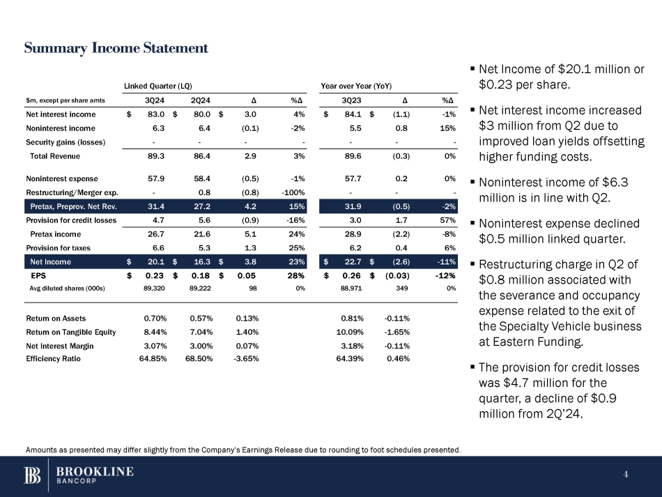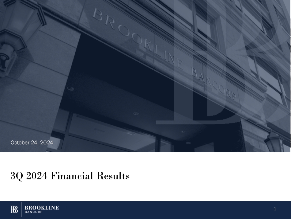 BOSTON, Oct. 23, 2024 (GLOBE NEWSWIRE) -- Brookline Bancorp, Inc. (NASDAQ: BRKL) (the “Company”) today announced net income and operating earnings after tax (non-GAAP) of $20.1 million, or $0.23 per basic and diluted share, for the third quarter of 2024, compared to net income of $16.4 million, or $0.18 per basic and diluted share, and operating earnings after tax (non-GAAP) of $17.0 million, or $0.19 per basic and diluted share, for the second quarter of 2024, and net income and operating earnings after tax (non-GAAP) of $22.7 million, or $0.26 per basic and diluted share, for the third quarter of 2023.