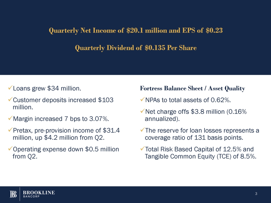 Forward Looking Statements 2 Certain statements contained in this press release that are not historical facts may constitute forward - looking statements within the meaning of Section 27A of the Securities Act of 1933, as amended, and Section 21E of the Securities Exchange Act of 1934, as amended, and are intended to be covered by the safe harbor provisions of the Private Securities Litigation Reform Act of 1995. We may also make forward - looking statements in other documents we file with the Securities and Exchange Commission ("SEC"), in our annual reports to shareholders, in press releases and other written materials, and in oral statements made by our officers, directors or employees. You can identify forward looking statements by the use of the words “believe,” “expect,” “anticipate,” “intend,” “estimate,” “assume,” “outlook,” “will,” “should,” and other expressions that predict or indicate future events and trends and which do not relate to historical matters, including statements regarding the Company’s business, credit quality, financial condition, liquidity and results of operations. Forward - looking statements may differ, possibly materially, from what is included in this press release due to factors and future developments that are uncertain and beyond the scope of the Company’s control. These include, but are not limited to, changes in interest rates; general economic conditions (including inflation and concerns about liquidity) on a national basis or in the local markets in which the Company operates; turbulence in the capital and debt markets; competitive pressures from other financial institutions; changes in consumer behavior due to changing political, business and economic conditions, or legislative or regulatory initiatives; changes in the value of securities and other assets in the Company’s investment portfolio; increases in loan and lease default and charge - off rates; the adequacy of allowances for loan and lease losses; decreases in deposit levels that necessitate increases in borrowing to fund loans and investments; operational risks including, but not limited to, cybersecurity incidents, fraud, natural disasters, and future pandemics; changes in regulation; the possibility that future credit losses may be higher than currently expected due to changes in economic assumptions and adverse economic developments; the risk that goodwill and intangibles recorded in the Company’s financial statements will become impaired; and changes in assumptions used in making such forward - looking statements. Forward - looking statements involve risks and uncertainties which are difficult to predict. The Company’s actual results could differ materially from those projected in the forward - looking statements as a result of, among others, the risks outlined in the Company’s Annual Report on Form 10 - K, as updated by its Quarterly Reports on Form 10 - Q and other filings submitted to the SEC. The Company does not undertake any obligation to update any forward - looking statement to reflect circumstances or events that occur after the date the forward - looking statements are made.
