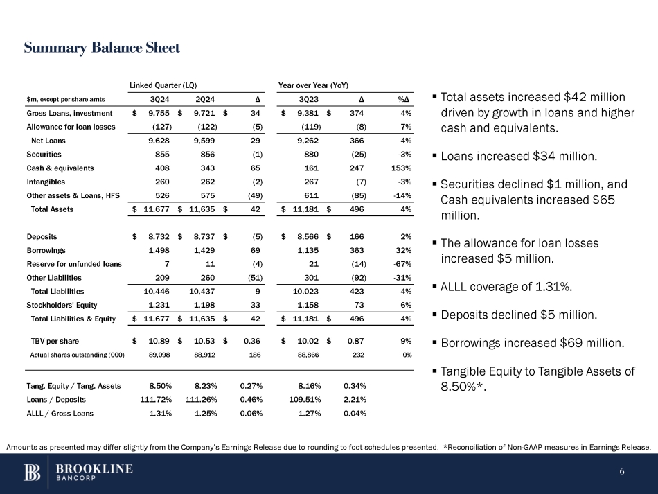 Total assets at September 30, 2024 were $11.7 billion, representing an increase of $41.4 million from $11.6 billion at June 30, 2024, and an increase of $496.2 million from September 30, 2023. At September 30, 2024, total loans and leases were $9.8 billion, representing an increase of $34.1 million from June 30, 2024, and an increase of $374.5 million from September 30, 2023.