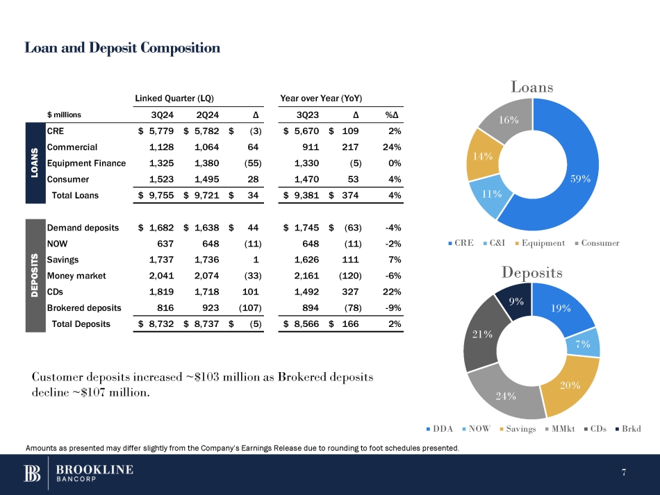 Summary Balance Sheet ▪ Total assets increased $42 million driven by growth in loans and higher cash and equivalents. ▪ Loans increased $34 million. ▪ Securities declined $1 million, and Cash equivalents increased $65 million. ▪ The allowance for loan losses increased $5 million. ▪ ALLL coverage of 1.31%. ▪ Deposits declined $5 million. ▪ Borrowings increased $69 million. ▪ Tangible Equity to Tangible Assets of 8.50%*. Year over Year (YoY) Linked Quarter (LQ) %Δ 3Q23 Δ Δ 3Q24 2Q24 $m, except per share amts 4% $ 9,381 $ 374 $ 34 $ 9,755 $ 9,721 Gross Loans, investment 7% (119) (8) (5) (127) (122) Allowance for loan losses 4% 366 9,262 29 9,599 9,628 Net Loans - 3% (25) 880 (1) 856 855 Securities 153% 247 161 65 343 408 Cash & equivalents - 3% (7) 267 (2) 262 260 Intangibles - 14% (85) 611 (49) 575 526 Other assets & Loans, HFS 4% 496 $ 11,181 $ 42 $ 11,635 $ 11,677 $ Total Assets 2% $ 166 $ 8,566 $ (5) $ 8,737 $ 8,732 Deposits 32% 363 1,135 69 1,429 1,498 Borrowings - 67% (14) 21 (4) 11 7 Reserve for unfunded loans - 31% (92) 301 (51) 260 209 Other Liabilities 4% 423 10,023 9 10,437 10,446 Total Liabilities 6% 73 1,158 33 1,198 1,231 Stockholders' Equity 4% $ 496 $ 11,181 $ 42 $ 11,635 $ 11,677 Total Liabilities & Equity 9% $ 0.87 $ 10.02 $ 0.36 $ 10.53 $ 10.89 TBV per share 0% 232 88,866 186 88,912 89,098 Actual shares outstanding (000) 0.34% 8.16% 0.27% 8.23% 8.50% Tang. Equity / Tang. Assets 2.21% 109.51% 0.46% 111.26% 111.72% Loans / Deposits 0.04% 1.27% 0.06% 1.25% 1.31% ALLL / Gross Loans Amounts as presented may differ slightly from the Company’s Earnings Release due to rounding to foot schedules presented. *Reconciliation of Non - GAAP measures in Earnings Release. 6