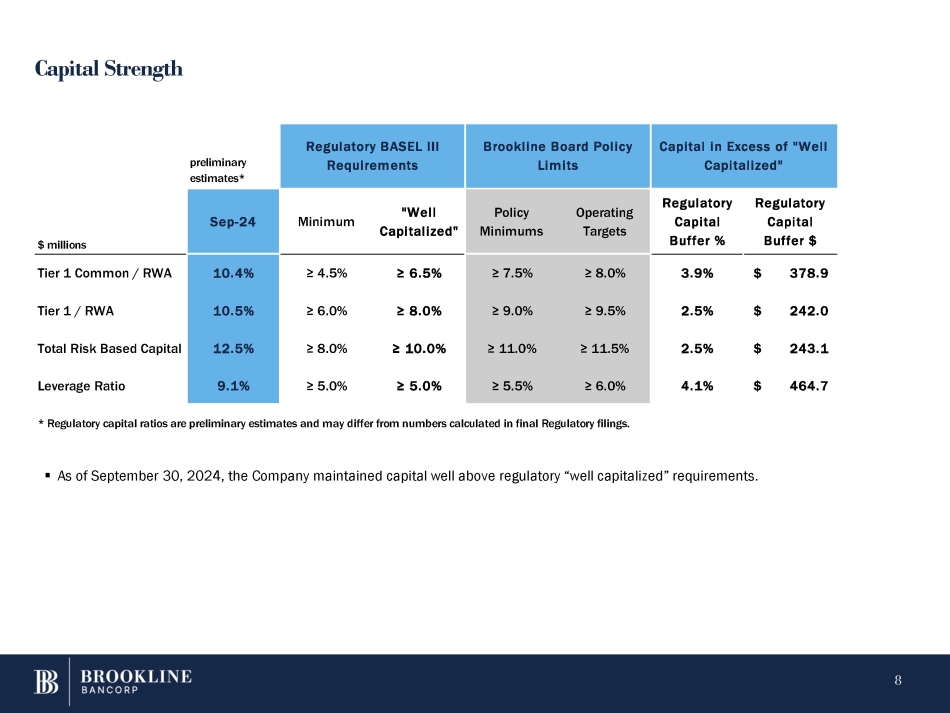 Loan and Deposit Composition 59% 11% 14% Loans 16% 19% 7% 20% 24% 21% 9% CRE C&I Equipment Consumer Deposits DDA NOW Savings MMkt CDs Brkd Amounts as presented may differ slightly from the Company’s Earnings Release due to rounding to foot schedules presented. %Δ Δ 3Q23 Δ 2Q24 3Q24 $ millions 2% $ 109 $ 5,670 $ (3) $ 5,782 $ 5,779 CRE 24% 217 911 64 1,064 1,128 Commercial S 0% (5) 1,330 (55) 1,380 1,325 Equipment Finance OA N 4% 53 1,470 28 1,495 1,523 Consumer L Total Loans $ 9,755 $ 9,721 $ 34 $ 9,381 $ 374 4% - 4% $ (63) $ 1,745 $ 44 $ 1,638 $ 1,682 Demand deposits - 2% (11) 648 (11) 648 637 NOW 7% 111 1,626 1 1,736 1,737 Savings - 6% (120) 2,161 (33) 2,074 2,041 Money market 22% 327 1,492 101 1,718 1,819 CDs - 9% (78) 894 (107) 923 816 Brokered deposits 2% $ 166 $ 8,566 $ (5) $ 8,737 $ 8,732 Total Deposits Linked Quarter (LQ) 7 Year over Year (YoY) DEPOSITS Customer deposits increased ~$103 million as Brokered deposits decline ~$107 million.