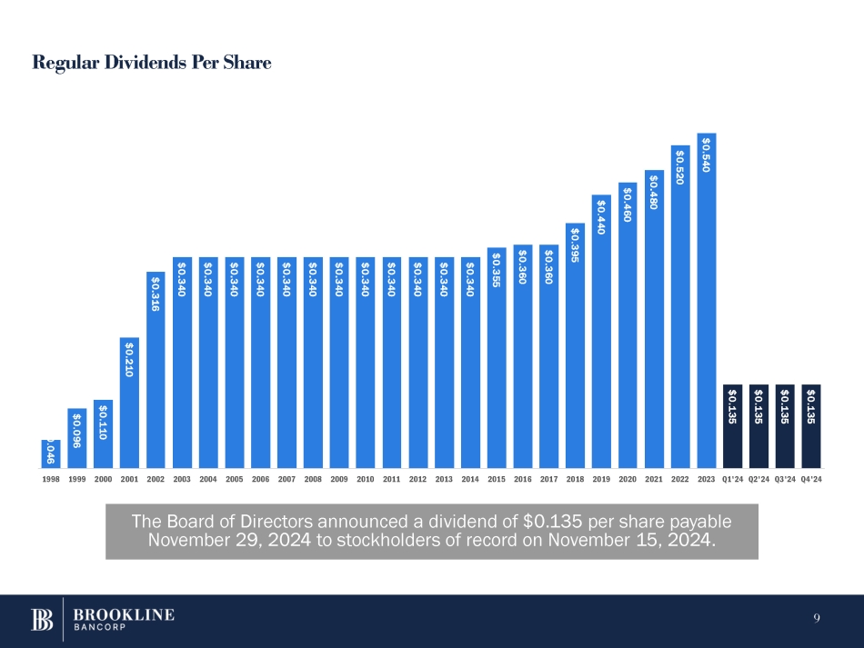 Capital Strength 8 ▪ As of September 30, 2024, the Company maintained capital well above regulatory “well capitalized” requirements. Capital in Excess of "Well Capitalized" Brookline Board Policy Limits Regulatory BASEL III Requirements preliminary estimates* Regulatory Capital Buffer $ Regulatory Capital Buffer % Operating Targets Policy Minimums "Well Capitalized" Minimum Sep - 24 $ millions $ 378.9 3.9% ≥ 8.0% ≥ 7.5% ≥ 6.5% ≥ 4.5% 10.4% Tier 1 Common / RWA $ 242.0 2.5% ≥ 9.5% ≥ 9.0% ≥ 8.0% ≥ 6.0% 10.5% Tier 1 / RWA $ 243.1 2.5% ≥ 11.5% ≥ 11.0% ≥ 10.0% ≥ 8.0% 12.5% Total Risk Based Capital $ 464.7 4.1% ≥ 6.0% ≥ 5.5% ≥ 5.0% ≥ 5.0% 9.1% Leverage Ratio * Regulatory capital ratios are preliminary estimates and may differ from numbers calculated in final Regulatory filings.