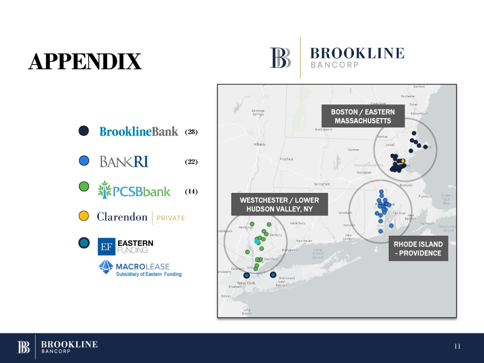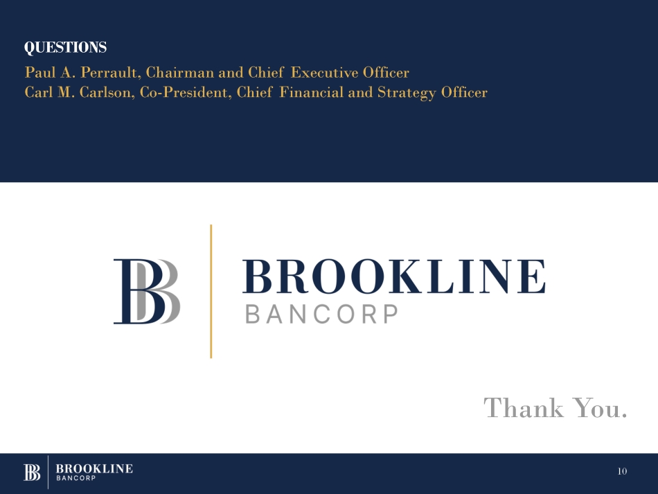Brookline Bancorp, Inc., a bank holding company with $11.7 billion in assets and branch locations in Massachusetts, Rhode Island, and the Lower Hudson Valley of New York State, is headquartered in Boston, Massachusetts and operates as the holding company for Brookline Bank, Bank Rhode Island, and PCSB Bank (the "banks"). The Company provides commercial and retail banking services, cash management and investment services to customers throughout Central New England and the Lower Hudson Valley of New York State. More information about Brookline Bancorp, Inc. and its banks can be found at the following websites: www.brooklinebank.com, www.bankri.com and www.pcsb.com.