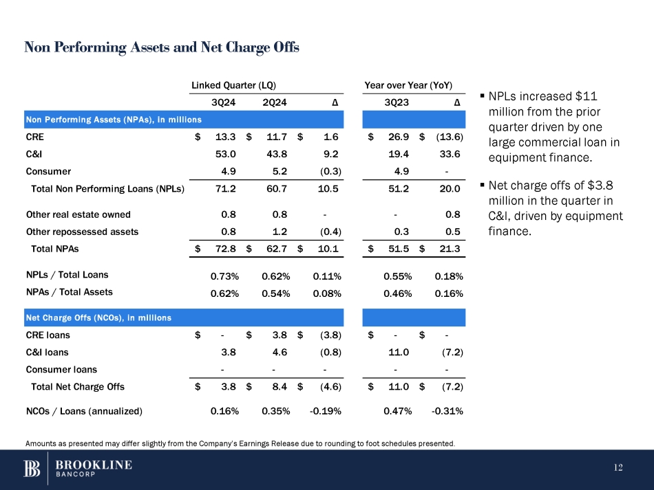 Total net charge-offs for the third quarter of 2024 were $3.8 million, compared to $8.4 million in the second quarter of 2024. The $3.8 million in net charge-offs was driven by $2.6 million in equipment financing, largely within specialty vehicle. The ratio of net loan and lease charge-offs to average loans and leases on an annualized basis decreased to 16 basis points for the third quarter of 2024 from 35 basis points for the second quarter of 2024.