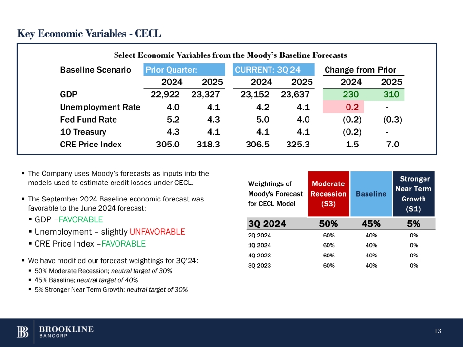 Non Performing Assets and Net Charge Offs Non Performing Assets (NPAs), in millions $ (13.6) $ 26.9 $ 1.6 $ 11.7 $ 13.3 CRE 33.6 19.4 9.2 43.8 53.0 C&I - 4.9 (0.3) 5.2 4.9 Consumer 20.0 51.2 10.5 60.7 Total Non Performing Loans (NPLs) 71.2 0.8 - - 0.8 Other real estate owned 0.8 finance. 0.5 0.3 (0.4) 1.2 Other repossessed assets 0.8 $ 21.3 $ 51.5 $ 10.1 $ 62.7 Total NPAs $ 72.8 0.18% 0.55% 0.11% 0.62% NPLs / Total Loans 0.73% 0.16% 0.46% 0.08% 0.54% NPAs / Total Assets 0.62% Net Charge Offs (NCOs), in millions $ - $ - $ (3.8) $ 3.8 $ - CRE loans (7.2) 11.0 (0.8) 4.6 3.8 C&I loans - - - - - Consumer loans $ (7.2) $ 11.0 $ (4.6) $ 8.4 $ 3.8 Total Net Charge Offs - 0.31% 0.47% - 0.19% 0.35% 0.16% NCOs / Loans (annualized) Linked Quarter (LQ) 3Q24 2Q24 Year over Year (YoY) Δ 3Q23 Δ Amounts as presented may differ slightly from the Company’s Earnings Release due to rounding to foot schedules presented. 12 ▪ NPLs increased $11 million from the prior quarter driven by one large commercial loan in equipment finance. ▪ Net charge offs of $3.8 million in the quarter in C&I, driven by equipment