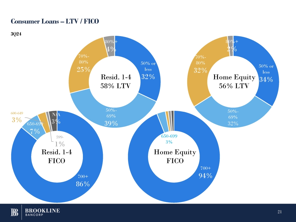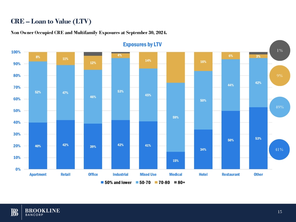 CRE – Loan to Value (LTV) 40% 42% 39% 42% 41% 15% 34% 50% 53% 52% 47% 46% 53% 45% 59% 50% 44% 42% 8% 11% 12% 4% 14% 16% 6% 3% 0% 10% 20% 30% 40% 50% 60% 70% 80% 90% 100% Apartment Retail Office Industrial 50% and lower Mixed Use 50 - 70 Medical Hotel Restaurant Other Non Owner Occupied CRE and Multifamily Exposures at September 30, 2024. Exposures by LTV 70 - 80 80+ 41% 49% 1% 9% 15