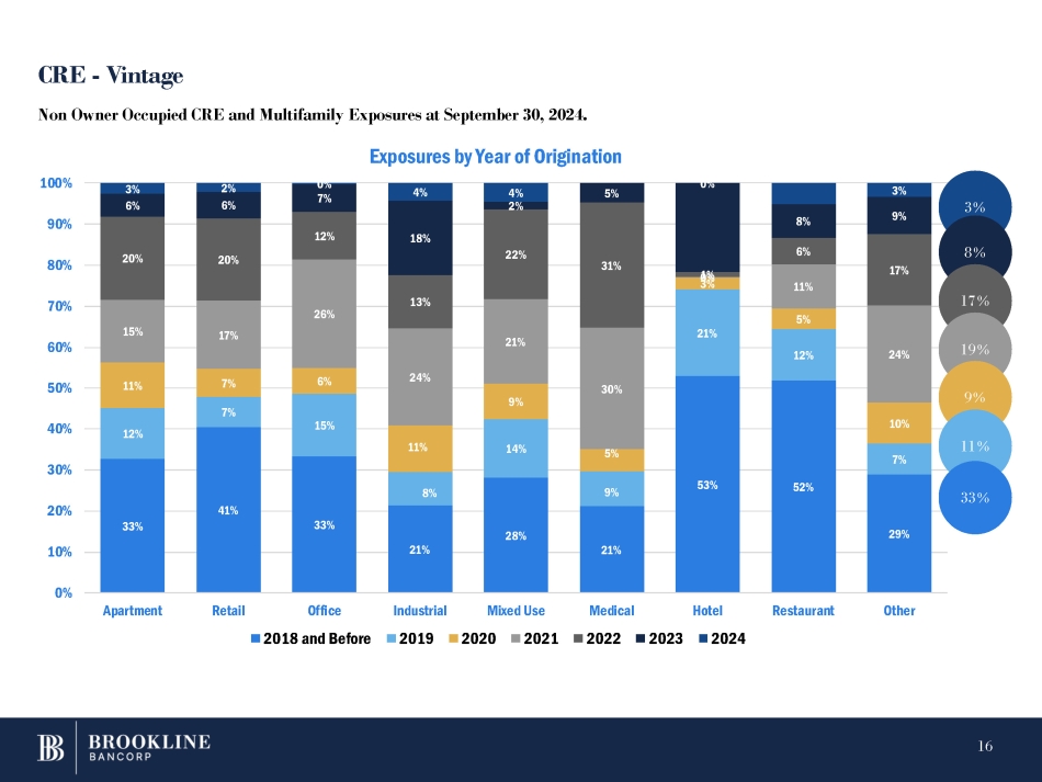 33% 41% 33% 21% 28% 21% 53% 52% 29% 12% 7% 15% 8% 14% 9% 21% 12% 7% 7% 6% 11% 9% 5% 3% 5% 10% 17% 26% 24% 21% 30% 11% 24% 20% 15% 11% 20% 12% 13% 22% 31% 1 0 % 6% 17% 6% 6% 7% 18% 8% 9% 3% 2% 0% 4% 4% 5% 2% 0% 3% 0% 10% 20% 30% 40% 50% 60% 70% 80% 90% 100% Apartment Retail Office 2018 and Before Restaurant Other Non Owner Occupied CRE and Multifamily Exposures at September 30, 2024. Exposures by Year of Origination Industrial Mixed Use Medical Hotel 2019 2020 2021 2022 2023 2024 3 % CRE - Vintage 8 % 17 % 19 % 9 % 11 % 33 % 16