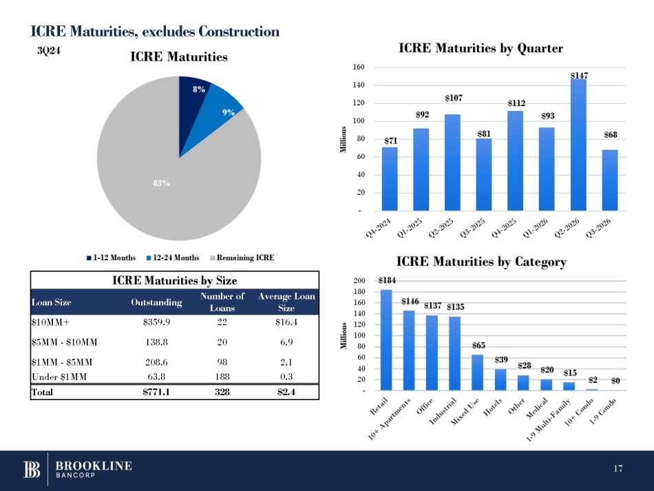 ICRE Maturities, excludes Construction 3Q24 ICRE Maturities by Size Average Loan Size Number of Loans Outstanding Loan Size $16.4 22 $359.9 $10MM+ 6.9 20 138.8 $5MM - $10MM 2.1 98 208.6 $1MM - $5MM 0.3 188 63.8 Under $1MM $2.4 328 $771.1 Total 17