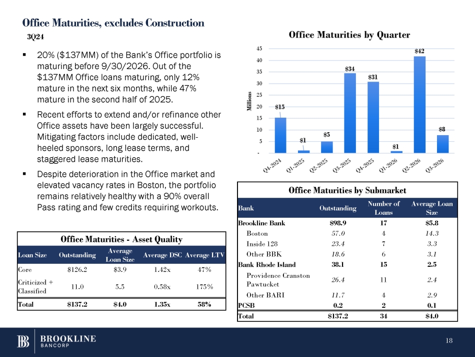 Office Maturities, excludes Construction 3Q24 ▪ 20% ($137MM) of the Bank’s Office portfolio is maturing before 9/30/2026. Out of the $137MM Office loans maturing, only 12% mature in the next six months, while 47% mature in the second half of 2025. ▪ Recent efforts to extend and/or refinance other Office assets have been largely successful. Mitigating factors include dedicated, well - heeled sponsors, long lease terms, and staggered lease maturities. ▪ Despite deterioration in the Office market and elevated vacancy rates in Boston, the portfolio remains relatively healthy with a 90% overall Pass rating and few credits requiring workouts. Office Maturities by Submarket Average Loan Size Number of Loans Outstanding Bank $5.8 17 $98.9 Brookline Bank 14.3 4 57.0 Boston 3.3 7 23.4 Inside 128 3.1 6 18.6 Other BBK 2.5 15 38.1 Bank Rhode Island 2.4 11 26.4 Providence Cranston Pawtucket 2.9 4 11.7 Other BARI 0.1 2 0.2 PCSB $4.0 34 $137.2 Total Office Maturities - Asset Quality Average LTV Average DSC Average Loan Size Outstanding Loan Size 47% 1.42x $3.9 $126.2 Core 175% 0.58x 5.5 11.0 Criticized + Classified 58% 1.35x $4.0 $137.2 Total 18