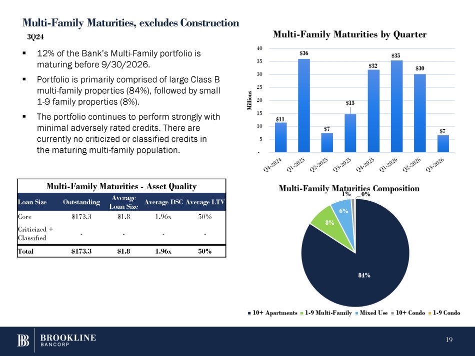 Multi - Family Maturities, excludes Construction 3Q24 ▪ 12 % of the Bank’s Multi - Family portfolio is maturing before 9 / 30 / 2026 . ▪ Portfolio is primarily comprised of large Class B multi - family properties ( 84 % ), followed by small 1 - 9 family properties ( 8 % ) . ▪ The portfolio continues to perform strongly with minimal adversely rated credits. There are currently no criticized or classified credits in the maturing multi - family population. Multi - Family Maturities - Asset Quality Average LTV Average DSC Average Loan Size Outstanding Loan Size 50% 1.96x $1.8 $173.3 Core - - - - Criticized + Classified 50% 1.96x $1.8 $173.3 Total 19