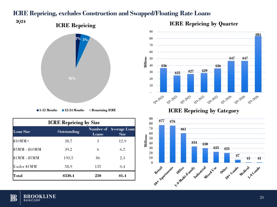 ICRE Repricing, excludes Construction and Swapped/Floating Rate Loans 3Q24 ICRE Repricing by Size Average Loan Size Number of Loans Outstanding Loan Size 12.9 3 38.7 $10MM+ 6.5 6 39.2 $5MM - $10MM 2.3 86 193.5 $1MM - $5MM 0.4 135 58.9 Under $1MM $1.4 230 $330.4 Total 20