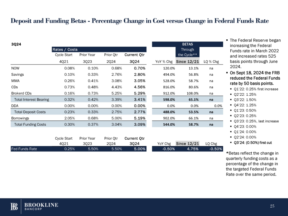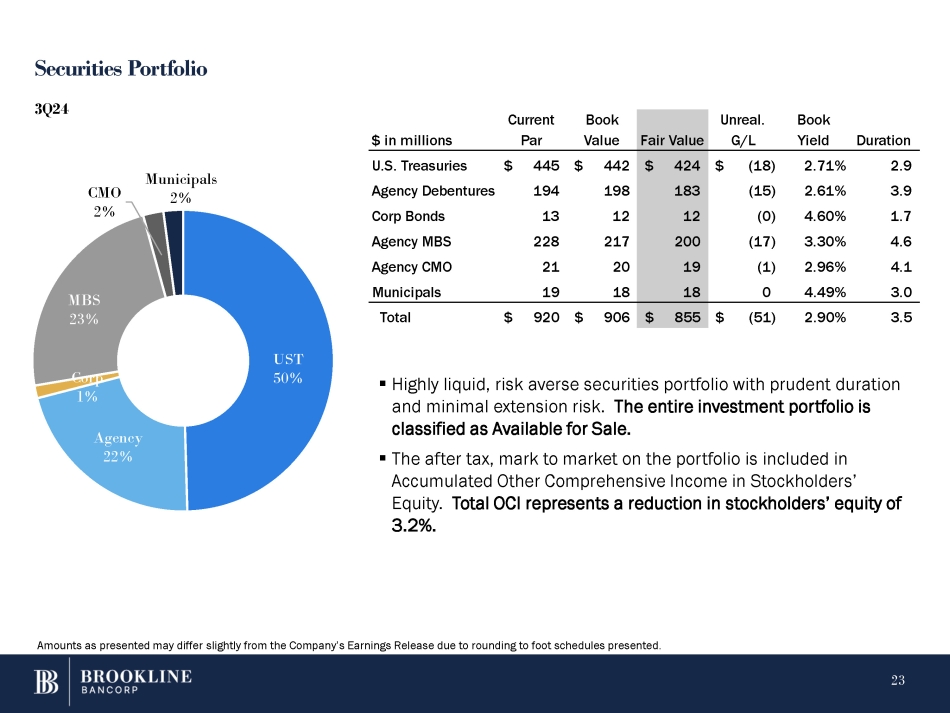 Securities Portfolio ▪ Highly liquid, risk averse securities portfolio with prudent duration and minimal extension risk. The entire investment portfolio is classified as Available for Sale. ▪ The after tax, mark to market on the portfolio is included in Accumulated Other Comprehensive Income in Stockholders’ Equity. Total OCI represents a reduction in stockholders’ equity of 3.2%. UST 50% 23 Agency 22% Corp 1% MBS 23% CMO 2% Municipals 2% 3Q24 Amounts as presented may differ slightly from the Company’s Earnings Release due to rounding to foot schedules presented. Duration Book Yield Unreal. G/L Fair Value Book Value Current Par $ in millions 2.9 2.71% $ (18) $ 424 $ 442 $ 445 U.S. Treasuries 3.9 2.61% (15) 183 198 194 Agency Debentures 1.7 4.60% (0) 12 12 13 Corp Bonds 4.6 3.30% (17) 200 217 228 Agency MBS 4.1 2.96% (1) 19 20 21 Agency CMO 3.0 4.49% 0 18 18 19 Municipals 3.5 2.90% $ (51) $ 855 $ 906 $ 920 Total