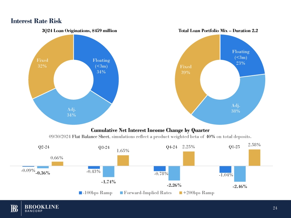 Interest Rate Risk Floating (<3m) 34% Adj. 34% Fixed 32% 3Q24 Loan Originations, $459 million Total Loan Portfolio Mix – Duration 2.2 - 0.43% - 0.78% - 1.04% - 0.09% - 0.36% - 1.74% - 2.46% 0.66% 2.25% - 2.26% Forward - Implied Rates 2.58% Cumulative Net Interest Income Change by Quarter 09/30/2024 Flat Balance Sheet , simulations reflect a product weighted beta of 40% on total deposits. - 100bps Ramp Q2 - 24 Q3 - 24 1.65% Q4 - 24 +200bps Ramp Q1 - 25 Floating (<3m) 23% 24 Adj. 38% Fixed 39%