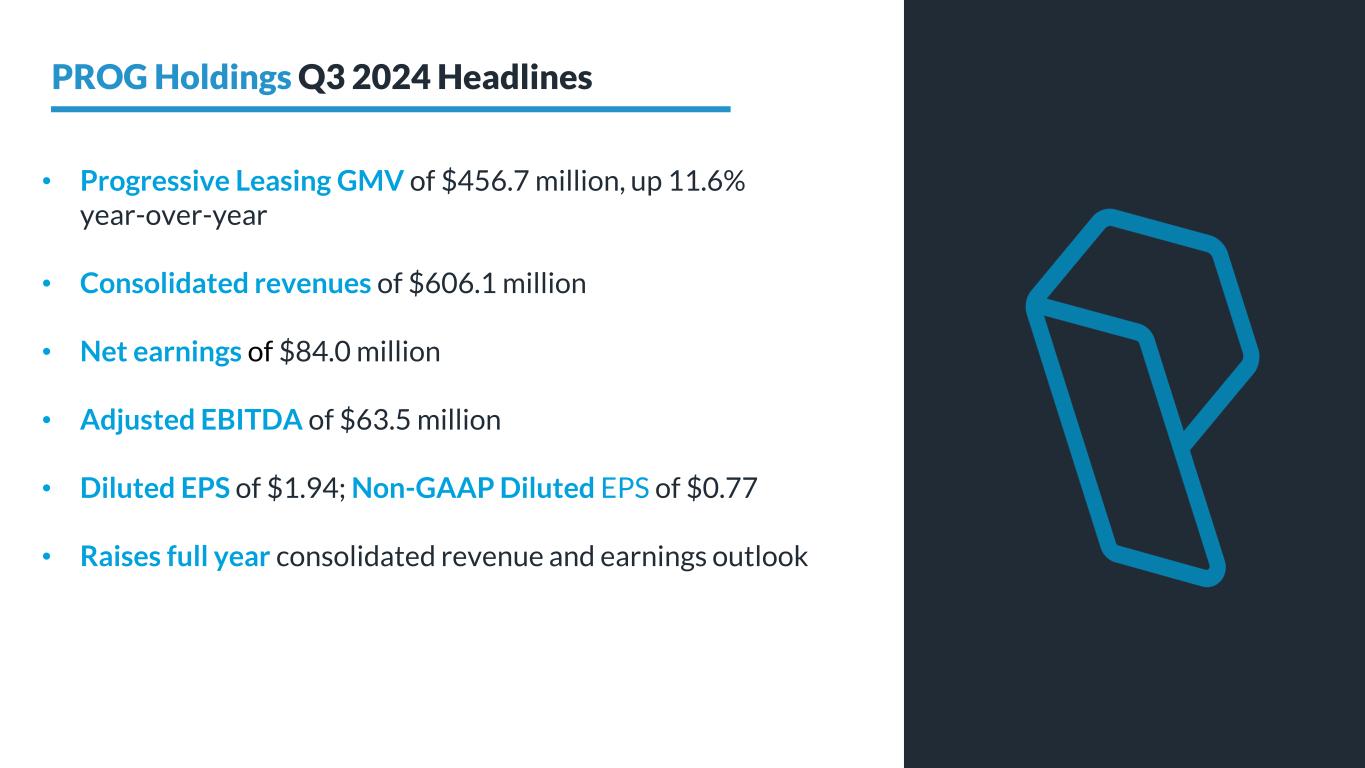 2 Statements in this earnings supplement regarding our business that are not historical facts are "forward-looking statements" that involve risks and uncertainties which could cause actual results to differ materially from those contained in the forward-looking statements. Such forward-looking statements generally can be identified by the use of forward-looking terminology, such as “planned”, “expectation”, “outlook”, “continuation” and similar forward-looking terminology. These risks and uncertainties include factors such as (i) continued volatility and challenges in the macro environment and, in particular, the unfavorable effects on our business of significant inflation, elevated interest rates, and fears of a recession, and the impact of those headwinds on: (a) consumer confidence and customer demand for the merchandise that our POS partners sell, in particular consumer durables; (b) our customers’ disposable income and their ability to make the lease and loan payments they owe the Company; (c) the availability of consumer credit; and (d) our overall financial performance and outlook; (ii) our businesses being subject to extensive laws and regulations, including laws and regulations unique to the industries in which our businesses operate, that may subject them to government investigations and significant monetary penalties and compliance-related burdens, as well as an increased focus by federal, state and local regulators on the industries within which our businesses operate, including with respect to consumer protection, customer privacy, third party and employee fraud and information security; (iii) deteriorating macroeconomic conditions resulting in the algorithms and other proprietary decisioning tools used in approving Progressive Leasing and Vive customers for leases and loans no longer being indicative of their ability to perform, which may limit the ability of those businesses to avoid lease and loan charge-offs or may result in their reserves being insufficient to cover actual losses; (iv) the impact of the cybersecurity incident experienced by Progressive Leasing in September 2023 and expenses incurred in connection with responding to the matter, including the litigation filed in response to that incident, or any regulatory proceedings that may result from the incident; (v) a large percentage of the Company’s revenues being concentrated with several of Progressive Leasing’s key POS partners; (vi) the risks that Progressive Leasing will be unable to attract new POS partners or retain and grow its business with its existing POS partners; (vii) Vive’s and Four’s business models differing significantly from Progressive Leasing’s, which creates specific and unique risks for each of the Vive and Four businesses, including Vive’s reliance on a limited number of bank partners to issue its credit products and each of Vive’s and Four’s exposure to the unique regulatory risks associated with the laws and regulations that apply to each of their businesses; (viii) our ability to continue to protect confidential, proprietary, or sensitive information, including the personal and confidential information of our customers, which may be adversely affected by cyber-attacks, employee or other internal misconduct, computer viruses, electronic break-ins or "hacking", or similar disruptions, any one of which could have a material adverse impact on our results of operations, financial condition, and prospects; (ix) our cost reduction initiatives may not be adequate or may have unintended consequences that could be disruptive to our businesses, including with respect to our global workforce strategy; (x) the risk that our capital allocation strategy, including our current stock repurchase and dividend programs, as well as any future debt repurchase program, will not be effective at enhancing shareholder value and may have an adverse impact on our cash reserves; (xi) the loss of the services of our key executives or our inability to attract and retain key talent, particularly with respect to our information technology function, may have a material adverse impact on our operations; (xii) increased competition from traditional and virtual lease-to-own competitors and also from competitors of our Vive segment; (xiii) the transactions offered by our Progressive Leasing, Vive and/or Four businesses may be negatively characterized by government officials, consumer advocacy groups or the media; (xiv) real or perceived software or system errors, failures, bugs, defects or outages, including those that may be caused by third-party vendors, may adversely affect Progressive Leasing, Vive or Four; and (xv) the other risks and uncertainties discussed under "Risk Factors" in the Company’s Annual Report on Form 10-K for the fiscal year ended December 31, 2023, filed with the SEC on February 21, 2024. Statements in this earnings supplement that are "forward-looking" include without limitation statements about: (i) our initiatives to drive improvements across our key performance metrics; (ii) our ability to create long-term value for our shareholders; and (iii) our revised full year 2024 outlook and our fourth quarter 2024 outlook. You are cautioned not to place undue reliance on these forward-looking statements, which speak only as of the date of this earnings supplement. Except as required by law, the Company undertakes no obligation to update these forward-looking statements to reflect subsequent events or circumstances after the date of this earnings supplement. Use of Forward-Looking Statements