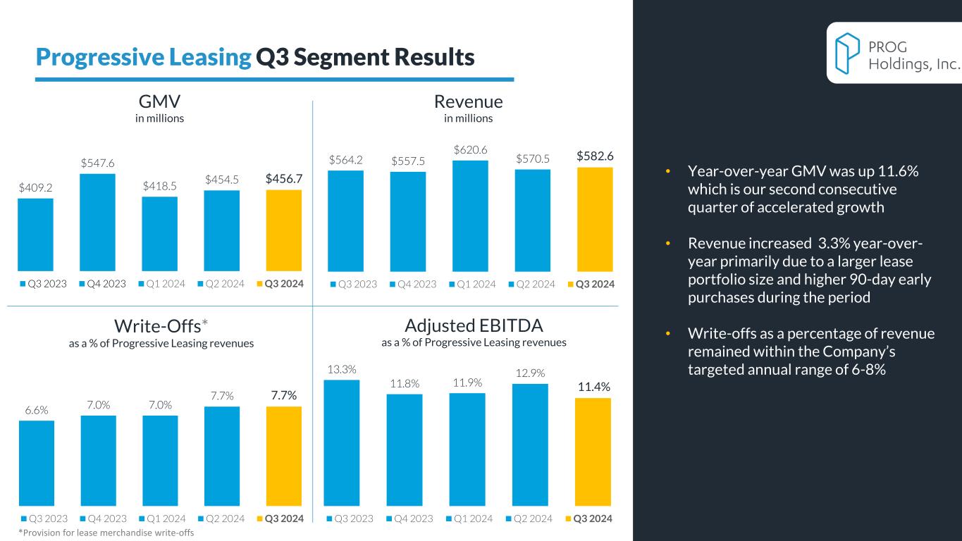PROG Internal 10 2024 2023 GMV $456.7 $409.2 11.6% Revenue $582.6 $564.2 3.3% Gross Margin % 31.2% 32.3% -110bps SG&A % 13.1% 13.7% -60 bps Write-Off %* 7.7% 6.6% 110 bps Adjusted EBITDA $ $66.5 $74.8 -11.1% Adjusted EBITDA % 11.4% 13.3% -190 bps Three Months Ended September 30 Change *The provision for lease merchandise write-offs as a percentage of Progressive Leasing revenue All dollar amounts in millions GAAP to non-GAAP reconciliation tables available in appendix Progressive Leasing Q3 Segment Results