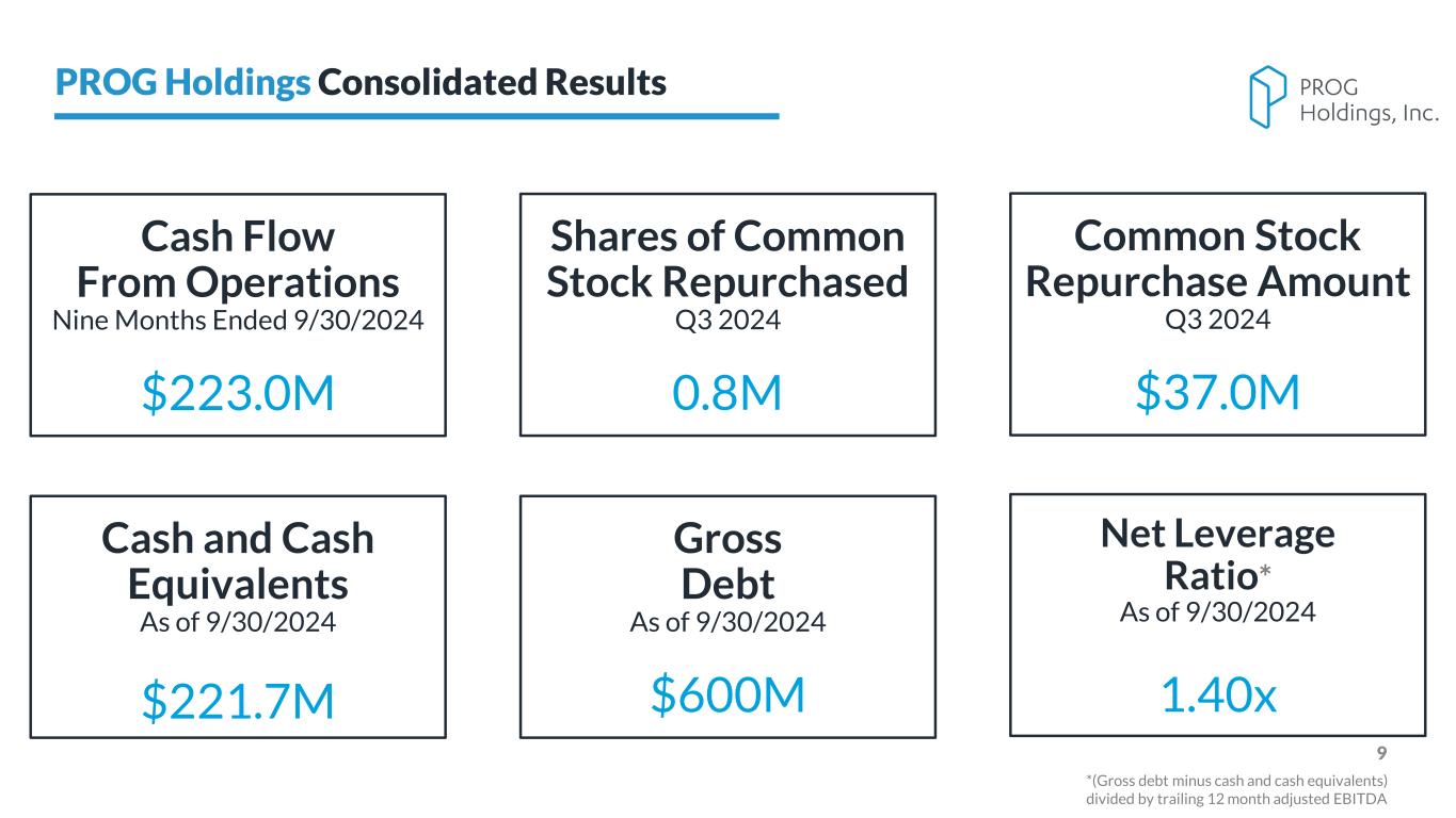 PROG Internal 8 All dollar amounts in millions except EPS GAAP to non-GAAP reconciliation tables available in appendix PROG Holdings Consolidated Q3 Results