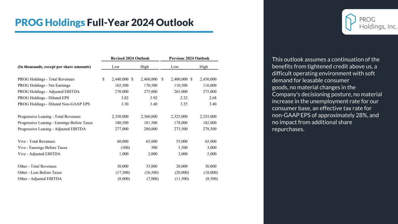 business models differing significantly from Progressive Leasing’s, which creates specific and unique risks for each of the Vive and Four businesses, including Vive’s reliance on a limited number of bank partners to issue its credit products and each of Vive’s and Four’s exposure to the unique regulatory risks associated with the laws and regulations that apply to each of their businesses; (viii) our ability to continue to protect confidential, proprietary, or sensitive information, including the personal and confidential information of our customers, which may be adversely affected by cyber-attacks, employee or other internal misconduct, computer viruses, electronic break-ins or "hacking", or similar disruptions, any one of which could have a material adverse impact on our results of operations, financial condition, and prospects; (ix) our cost reduction initiatives may not be adequate or may have unintended consequences that could be disruptive to our businesses, including with respect to our global workforce strategy; (x) the risk that our capital allocation strategy, including our current stock repurchase and dividend programs, as well as any future debt repurchase program, will not be effective at enhancing shareholder value and may have an adverse impact on our cash reserves; (xi) the loss of the services of our key executives or our inability to attract and retain key talent, particularly with respect to our information technology function, may have a material adverse impact on our operations; (xii) increased competition from traditional and virtual lease-to-own competitors and also from competitors of our Vive segment; (xiii) the transactions offered by our Progressive Leasing, Vive and/or Four businesses may be negatively characterized by government officials, consumer advocacy groups or the media; (xiv) real or perceived software or system errors, failures, bugs, defects or outages, including those that may be caused by third-party vendors, may adversely affect Progressive Leasing, Vive or Four; and (xv) the other risks and uncertainties discussed under "Risk Factors" in the Company’s Annual Report on Form 10-K for the fiscal year ended December 31, 2023, filed with the SEC on February 21, 2024. Statements in this press release that are "forward-looking" include without limitation statements about: (i) our initiatives to drive improvements across our key performance metrics; (ii) our ability to create long-term value for our shareholders; and (iii) our revised full year 2024 outlook and our fourth quarter 2024 outlook. You are cautioned not to place undue reliance on these forward-looking statements, which speak only as of the date of this press release. Except as required by law, the Company undertakes no obligation to update these forward-looking statements to reflect subsequent events or circumstances after the date of this press release.