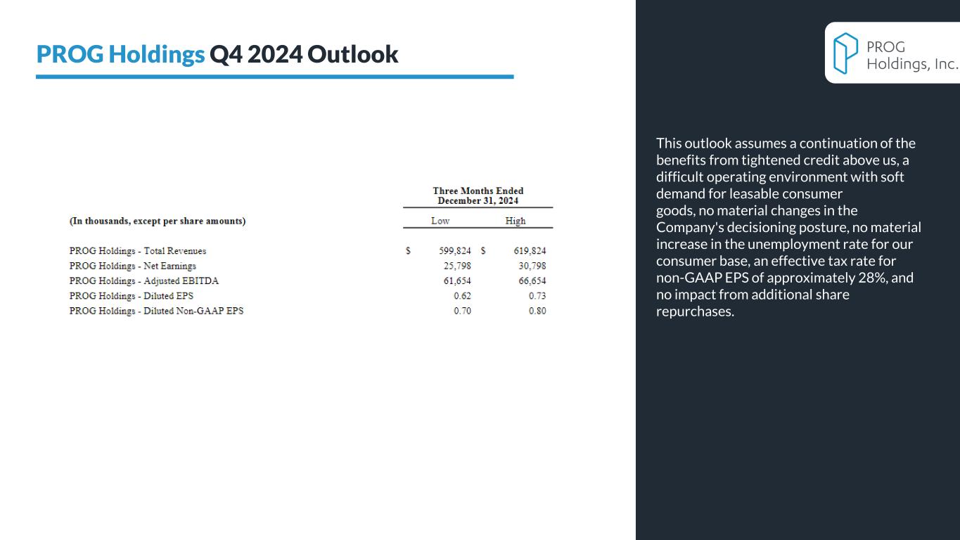 PROG Holdings is updating its full year 2024 outlook for revenue and earnings as well as providing its outlook for revenues, net earnings, adjusted EBITDA, GAAP diluted EPS and non-GAAP diluted EPS for the fourth quarter of 2024. This outlook assumes a continuation of the benefits from tightened credit above us, a difficult operating environment with soft demand for leasable consumer goods, no material changes in the Company's decisioning posture, no material increase in the unemployment rate for our consumer base, an effective tax rate for non-GAAP EPS of approximately 28%, and no impact from additional share repurchases.