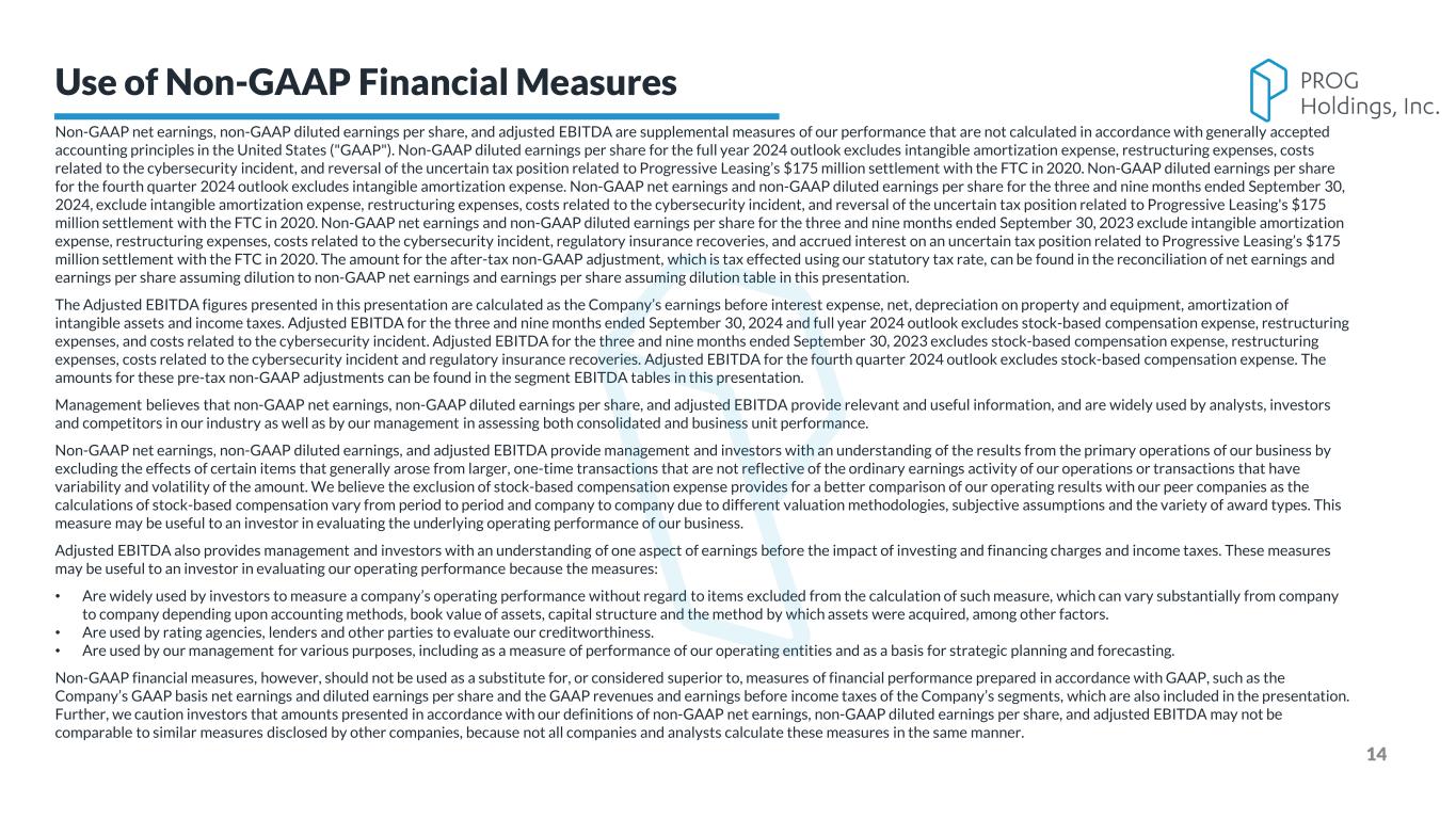 PROG Internal Non-GAAP net earnings, non-GAAP diluted earnings per share, and adjusted EBITDA are supplemental measures of our performance that are not calculated in accordance with generally accepted accounting principles in the United States ("GAAP"). Non-GAAP diluted earnings per share for the full year 2024 outlook excludes intangible amortization expense, restructuring expenses, costs related to the cybersecurity incident, and reversal of the uncertain tax position related to Progressive Leasing’s $175 million settlement with the FTC in 2020. Non-GAAP diluted earnings per share for the fourth quarter 2024 outlook excludes intangible amortization expense. Non-GAAP net earnings and non-GAAP diluted earnings per share for the three and nine months ended September 30, 2024, exclude intangible amortization expense, restructuring expenses, costs related to the cybersecurity incident, and reversal of the uncertain tax position related to Progressive Leasing's $175 million settlement with the FTC in 2020. Non-GAAP net earnings and non-GAAP diluted earnings per share for the three and nine months ended September 30, 2023 exclude intangible amortization expense, restructuring expenses, costs related to the cybersecurity incident, regulatory insurance recoveries, and accrued interest on an uncertain tax position related to Progressive Leasing’s $175 million settlement with the FTC in 2020. The amount for the after-tax non-GAAP adjustment, which is tax effected using our statutory tax rate, can be found in the reconciliation of net earnings and earnings per share assuming dilution to non-GAAP net earnings and earnings per share assuming dilution table in this presentation. The Adjusted EBITDA figures presented in this presentation are calculated as the Company’s earnings before interest expense, net, depreciation on property and equipment, amortization of intangible assets and income taxes. Adjusted EBITDA for the three and nine months ended September 30, 2024 and full year 2024 outlook excludes stock-based compensation expense, restructuring expenses, and costs related to the cybersecurity incident. Adjusted EBITDA for the three and nine months ended September 30, 2023 excludes stock-based compensation expense, restructuring expenses, costs related to the cybersecurity incident and regulatory insurance recoveries. Adjusted EBITDA for the fourth quarter 2024 outlook excludes stock-based compensation expense. The amounts for these pre-tax non-GAAP adjustments can be found in the segment EBITDA tables in this presentation. Management believes that non-GAAP net earnings, non-GAAP diluted earnings per share, and adjusted EBITDA provide relevant and useful information, and are widely used by analysts, investors and competitors in our industry as well as by our management in assessing both consolidated and business unit performance. Non-GAAP net earnings, non-GAAP diluted earnings, and adjusted EBITDA provide management and investors with an understanding of the results from the primary operations of our business by excluding the effects of certain items that generally arose from larger, one-time transactions that are not reflective of the ordinary earnings activity of our operations or transactions that have variability and volatility of the amount. We believe the exclusion of stock-based compensation expense provides for a better comparison of our operating results with our peer companies as the calculations of stock-based compensation vary from period to period and company to company due to different valuation methodologies, subjective assumptions and the variety of award types. This measure may be useful to an investor in evaluating the underlying operating performance of our business. Adjusted EBITDA also provides management and investors with an understanding of one aspect of earnings before the impact of investing and financing charges and income taxes. These measures may be useful to an investor in evaluating our operating performance because the measures: • Are widely used by investors to measure a company’s operating performance without regard to items excluded from the calculation of such measure, which can vary substantially from company to company depending upon accounting methods, book value of assets, capital structure and the method by which assets were acquired, among other factors. • Are used by rating agencies, lenders and other parties to evaluate our creditworthiness. • Are used by our management for various purposes, including as a measure of performance of our operating entities and as a basis for strategic planning and forecasting. Non-GAAP financial measures, however, should not be used as a substitute for, or considered superior to, measures of financial performance prepared in accordance with GAAP, such as the Company’s GAAP basis net earnings and diluted earnings per share and the GAAP revenues and earnings before income taxes of the Company’s segments, which are also included in the presentation. Further, we caution investors that amounts presented in accordance with our definitions of non-GAAP net earnings, non-GAAP diluted earnings per share, and adjusted EBITDA may not be comparable to similar measures disclosed by other companies, because not all companies and analysts calculate these measures in the same manner. 14 Use of Non-GAAP Financial Measures