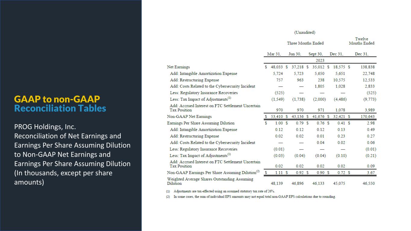 PROG Internal GAAP to non-GAAP Reconciliation Tables PROG Holdings, Inc. Reconciliation of Net Earnings and Earnings Per Share Assuming Dilution to Non-GAAP Net Earnings and Earnings Per Share Assuming Dilution (In thousands, except per share amounts)