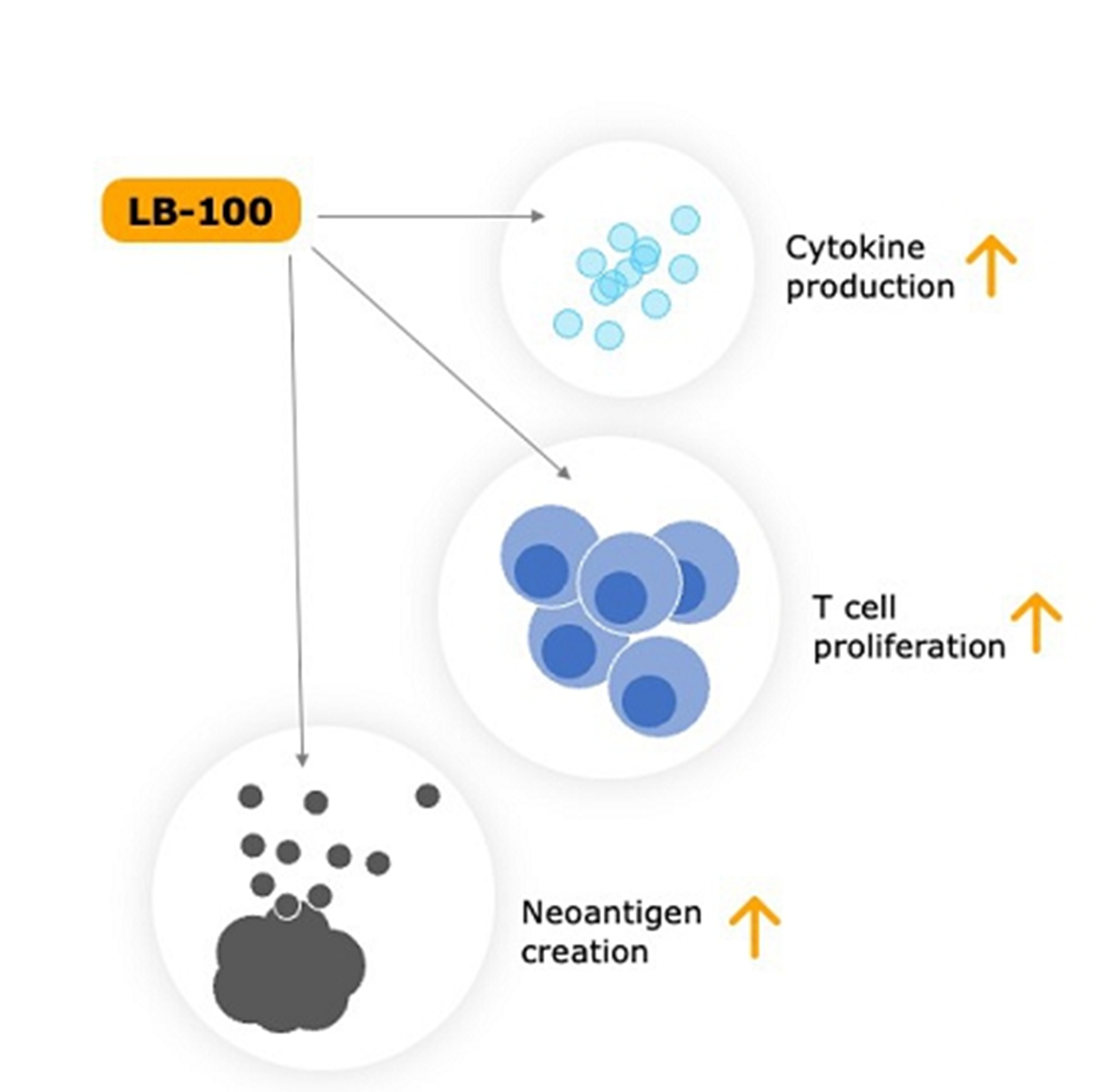 Low doses of LB-100 have now been shown to enhance immune checkpoint inhibition (“ICI”) by several different mechanisms affecting the tumor compartment and immune T-cell compartment. LB-100 increases CD8+T-cell infiltration and CD8-Treg ratio, CD8+T-cell proliferation, and cytokine production induces microsatellite instability, neoantigen production and immune responsiveness, converting immunologically “cold” to “hot” cancers.