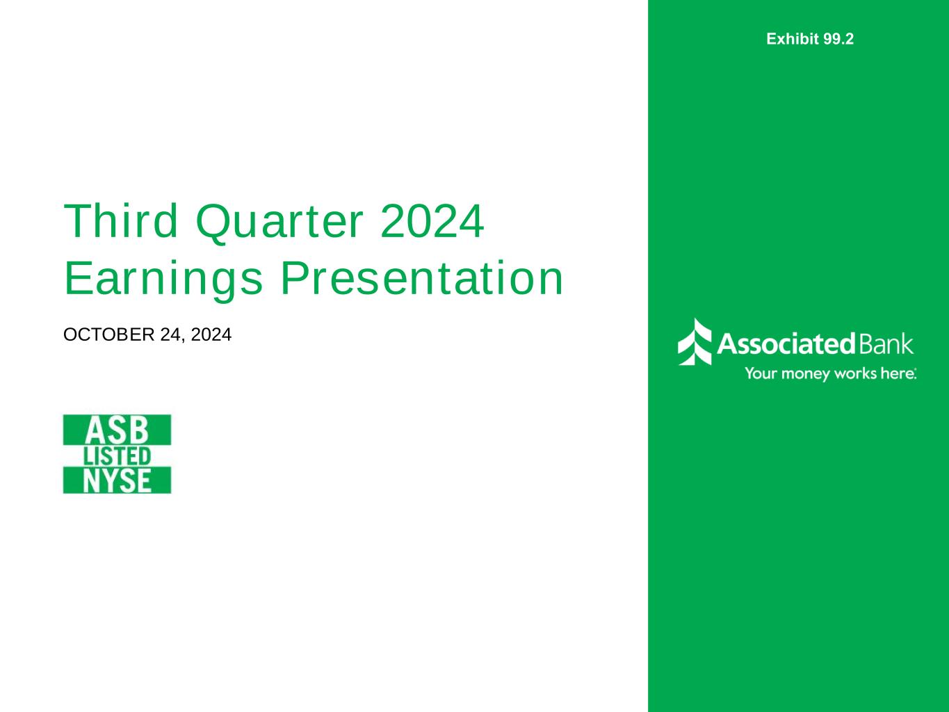 GREEN BAY, Wis. -- October 24, 2024 -- Associated Banc-Corp (NYSE: ASB) ("Associated" or "Company") today reported net income available to common equity ("earnings") of $85 million, or $0.56 per common share, for the quarter ended September 30, 2024. These amounts compare to earnings of $113 million, or $0.74 per common share, for the quarter ended June 30, 2024 and earnings of $80 million, or $0.53 per common share, for the quarter ended September 30, 2023.