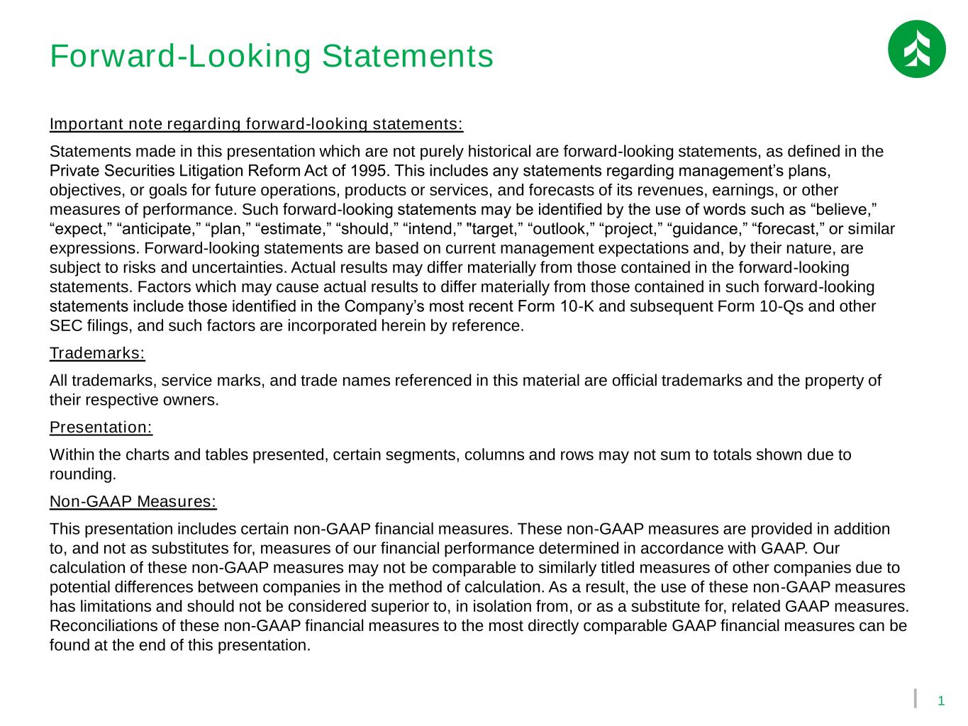 1 Forward-Looking Statements Important note regarding forward-looking statements: Statements made in this presentation which are not purely historical are forward-looking statements, as defined in the Private Securities Litigation Reform Act of 1995. This includes any statements regarding management’s plans, objectives, or goals for future operations, products or services, and forecasts of its revenues, earnings, or other measures of performance. Such forward-looking statements may be identified by the use of words such as “believe,” “expect,” “anticipate,” “plan,” “estimate,” “should,” “intend,” "target,” “outlook,” “project,” “guidance,” “forecast,” or similar expressions. Forward-looking statements are based on current management expectations and, by their nature, are subject to risks and uncertainties. Actual results may differ materially from those contained in the forward-looking statements. Factors which may cause actual results to differ materially from those contained in such forward-looking statements include those identified in the Company’s most recent Form 10-K and subsequent Form 10-Qs and other SEC filings, and such factors are incorporated herein by reference. Trademarks: All trademarks, service marks, and trade names referenced in this material are official trademarks and the property of their respective owners. Presentation: Within the charts and tables presented, certain segments, columns and rows may not sum to totals shown due to rounding. Non-GAAP Measures: This presentation includes certain non-GAAP financial measures. These non-GAAP measures are provided in addition to, and not as substitutes for, measures of our financial performance determined in accordance with GAAP. Our calculation of these non-GAAP measures may not be comparable to similarly titled measures of other companies due to potential differences between companies in the method of calculation. As a result, the use of these non-GAAP measures has limitations and should not be considered superior to, in isolation from, or as a substitute for, related GAAP measures. Reconciliations of these non-GAAP financial measures to the most directly comparable GAAP financial measures can be found at the end of this presentation.