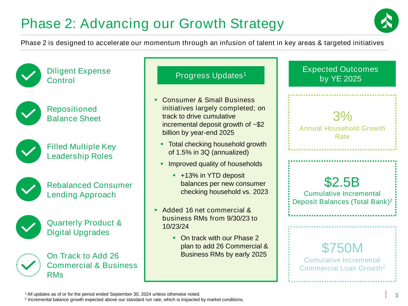 2 Third Quarter 2024 Results1 1 All figures shown on an end of period basis unless otherwise noted. Growth reflects 3Q 2024 results compared to 2Q 2024. 2 This is a non-GAAP financial measure. See appendix for a reconciliation of non-GAAP financial measures to GAAP financial measures. 3 Accruing loans 30-89 days past due + accruing loans 90+ days past due. ▪ GAAP diluted EPS of $0.56 ▪ Total core customer deposit2 growth of $618 million ▪ Total deposit growth of $863 million ▪ Total loan growth of $373 million ▪ Loans / deposits of 89.4% ▪ Net interest income of $263 million ▪ Net interest margin of 2.78% ▪ Noninterest income of $67 million ▪ Noninterest expense of $201 million ▪ Noninterest expense / avg. assets of 1.93% ▪ Provision for credit losses of $21 million ▪ ACLL / total loans of 1.33% ▪ NCOs / avg. loans (annualized) of 0.18% 3Q 2024 Operating Results $0.56 Diluted EPS +2.3% Core Customer Deposit Growth2 +2.6% Total Deposit Growth +1.3% Total Loan Growth +3 bps Net Interest Margin Change 0.19% Total Delinquencies3 / Total Loans 9.72% CET1 Ratio 7.50% TCE Ratio2 $20.37 Tangible Book Value / Share