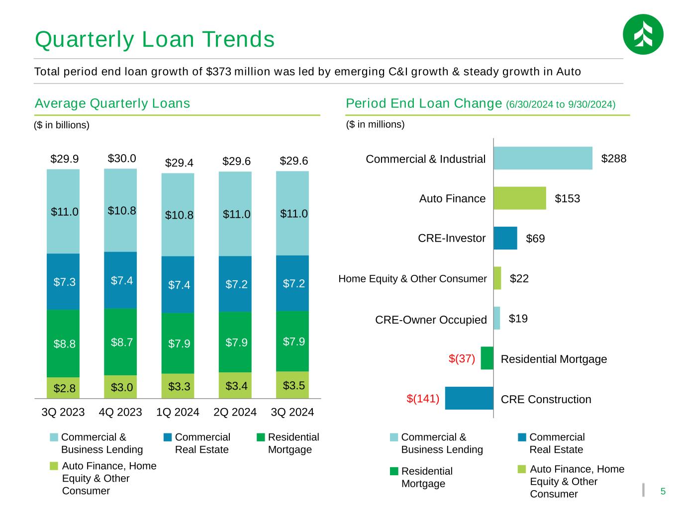 Third quarter 2024 period end total loans of $30.0 billion increased 1%, or $373 million, from the prior quarter and decreased 1%, or $202 million, from the same period last year. With respect to third quarter 2024 period end balances by loan category: