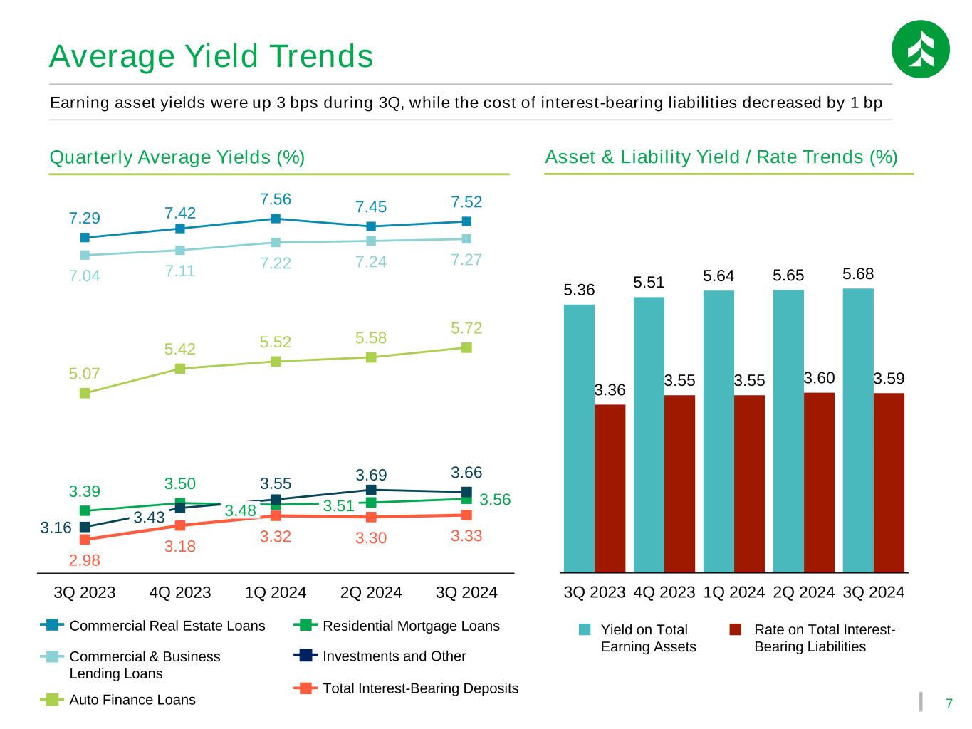 •The average yield on total loans for the third quarter of 2024 increased 6 basis points from the prior quarter and increased 31 basis points from the same period last year to 6.27%.