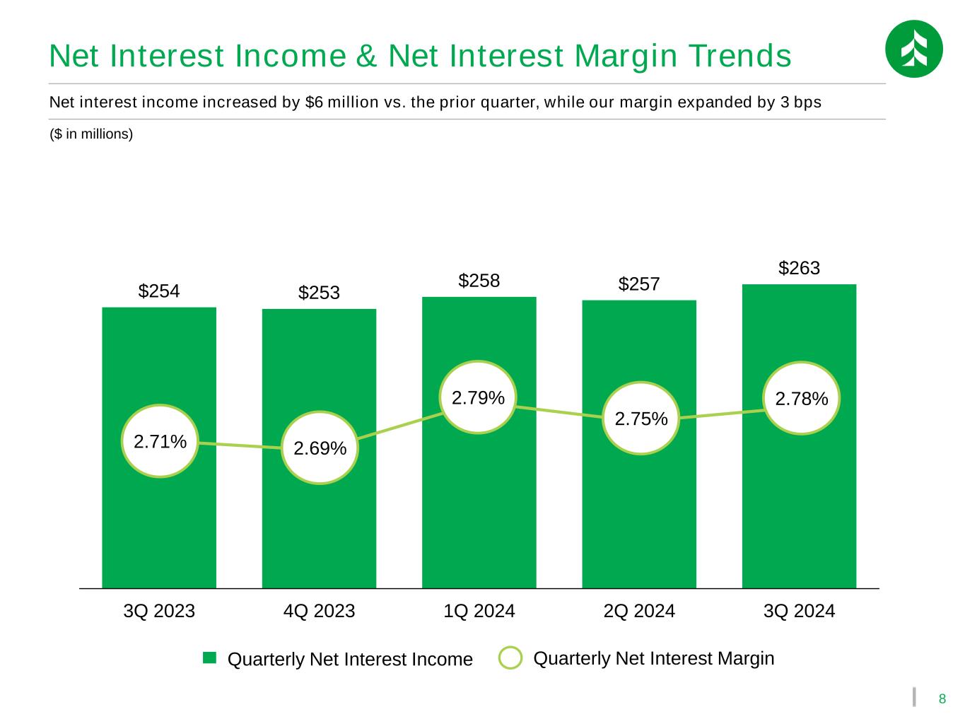 Third quarter 2024 net interest income of $263 million increased $6 million from the prior quarter and increased $8 million from the same period last year. The net interest margin increased to 2.78%, reflecting a 3 basis point increase from the prior quarter and a 7 basis point increase from the same period last year.