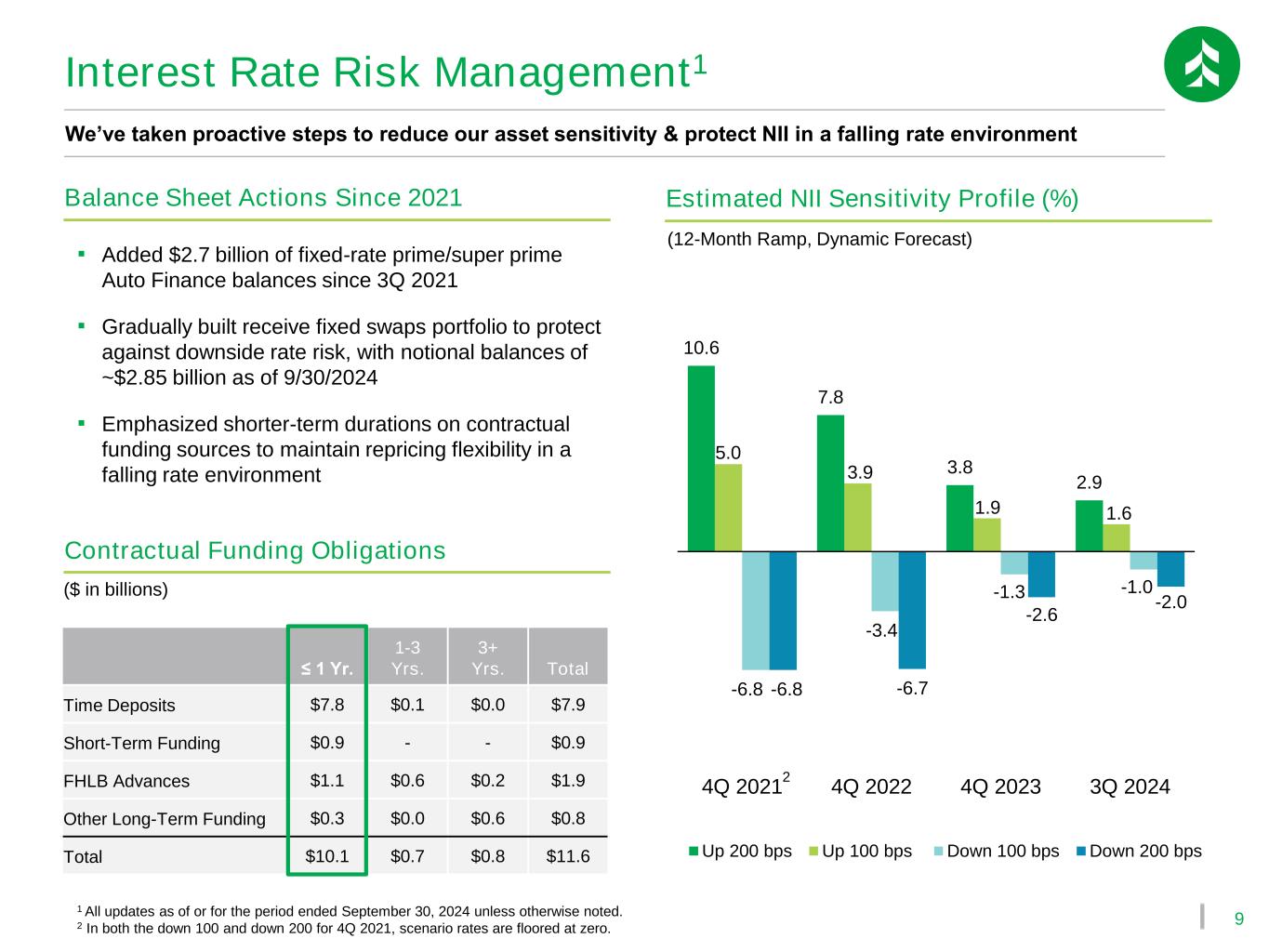 9 ▪ Added $2.7 billion of fixed-rate prime/super prime Auto Finance balances since 3Q 2021 ▪ Gradually built receive fixed swaps portfolio to protect against downside rate risk, with notional balances of ~$2.85 billion as of 9/30/2024 ▪ Emphasized shorter-term durations on contractual funding sources to maintain repricing flexibility in a falling rate environment We’ve taken proactive steps to reduce our asset sensitivity & protect NII in a falling rate environment Estimated NII Sensitivity Profile (%) Interest Rate Risk Management1 10.6 7.8 3.8 2.9 5.0 3.9 1.9 1.6 -6.8 -3.4 -1.3 -1.0 -6.8 -6.7 -2.6 -2.0 4Q 2021 4Q 2022 4Q 2023 3Q 2024 Up 200 bps Up 100 bps Down 100 bps Down 200 bps (12-Month Ramp, Dynamic Forecast) Balance Sheet Actions Since 2021 Contractual Funding Obligations ≤ 1 Yr. 1-3 Yrs. 3+ Yrs. Total Time Deposits $7.8 $0.1 $0.0 $7.9 Short-Term Funding $0.9 - - $0.9 FHLB Advances $1.1 $0.6 $0.2 $1.9 Other Long-Term Funding $0.3 $0.0 $0.6 $0.8 Total $10.1 $0.7 $0.8 $11.6 ($ in billions) 1 All updates as of or for the period ended September 30, 2024 unless otherwise noted. 2 In both the down 100 and down 200 for 4Q 2021, scenario rates are floored at zero. 2