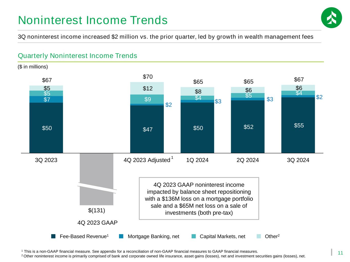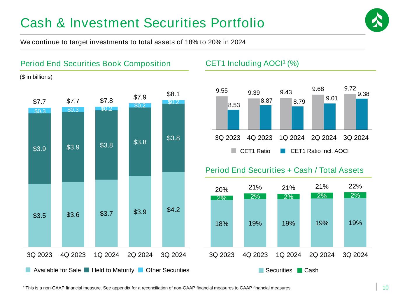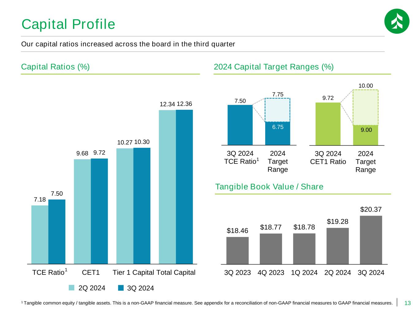 6 $1.6 $1.6 $1.7 $1.6 $1.6 $3.4 $3.5 $4.3 $3.9 $4.2 $2.5 $2.8 $2.9 $3.0 $3.3 $6.3 $6.1 $6.1 $6.0 $5.9 $4.8 $4.9 $4.9 $5.1 $5.1 $7.0 $7.2 $7.5 $7.3 $7.4 $6.3 $6.2 $5.9 $5.7 $5.7 $32.0 $32.2 $33.3 $32.6 $33.3 3Q 2023 4Q 2023 1Q 2024 2Q 2024 3Q 2024 Average Quarterly Deposits ($ in billions) Period End Funding Change (6/30/2024 to 9/30/2024) ($ in millions) Customer CDs Savings Money Market Network Transaction Deposits Noninterest-Bearing Demand Interest-Bearing Demand Brokered CDs 1 This is a non-GAAP financial measure. See appendix for a reconciliation of period end core customer deposits to total deposits. $(85) $(51) $42 $109 $603 Money Market Savings Interest-Bearing Demand $(760) $64 $181 $366 Brokered CDs Other Wholesale Funding FHLB Advances Core Customer Deposits1 +$618 (+2%) Wholesale Funding Sources $(149) (-2%) Total Deposits +$863 (+3%) Customer CDs Network Transaction Deposits Quarterly Deposit & Funding Trends Noninterest-Bearing Demand Core customer deposits1 grew 2% during 3Q, enabling us to decrease wholesale funding
