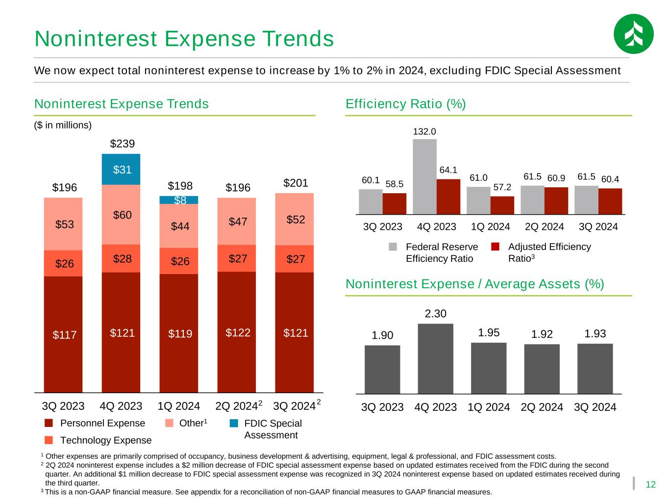11 $50 $47 $50 $52 $55 $7 $2 $3 $3 $2 $5 $9 $4 $5 $4 $5 $12 $8 $6 $6 $67 $70 $65 $65 $67 3Q 2023 4Q 2023 Adjusted 1Q 2024 2Q 2024 3Q 2024 Noninterest Income Trends ($ in millions) 3Q noninterest income increased $2 million vs. the prior quarter, led by growth in wealth management fees 1 This is a non-GAAP financial measure. See appendix for a reconciliation of non-GAAP financial measures to GAAP financial measures. 2 Other noninterest income is primarily comprised of bank and corporate owned life insurance, asset gains (losses), net and investment securities gains (losses), net. Quarterly Noninterest Income Trends Fee-Based Revenue1 Capital Markets, net Mortgage Banking, net Other2 4Q 2023 GAAP noninterest income impacted by balance sheet repositioning with a $136M loss on a mortgage portfolio sale and a $65M net loss on a sale of investments (both pre-tax) 1 4Q 2023 GAAP $(131)
