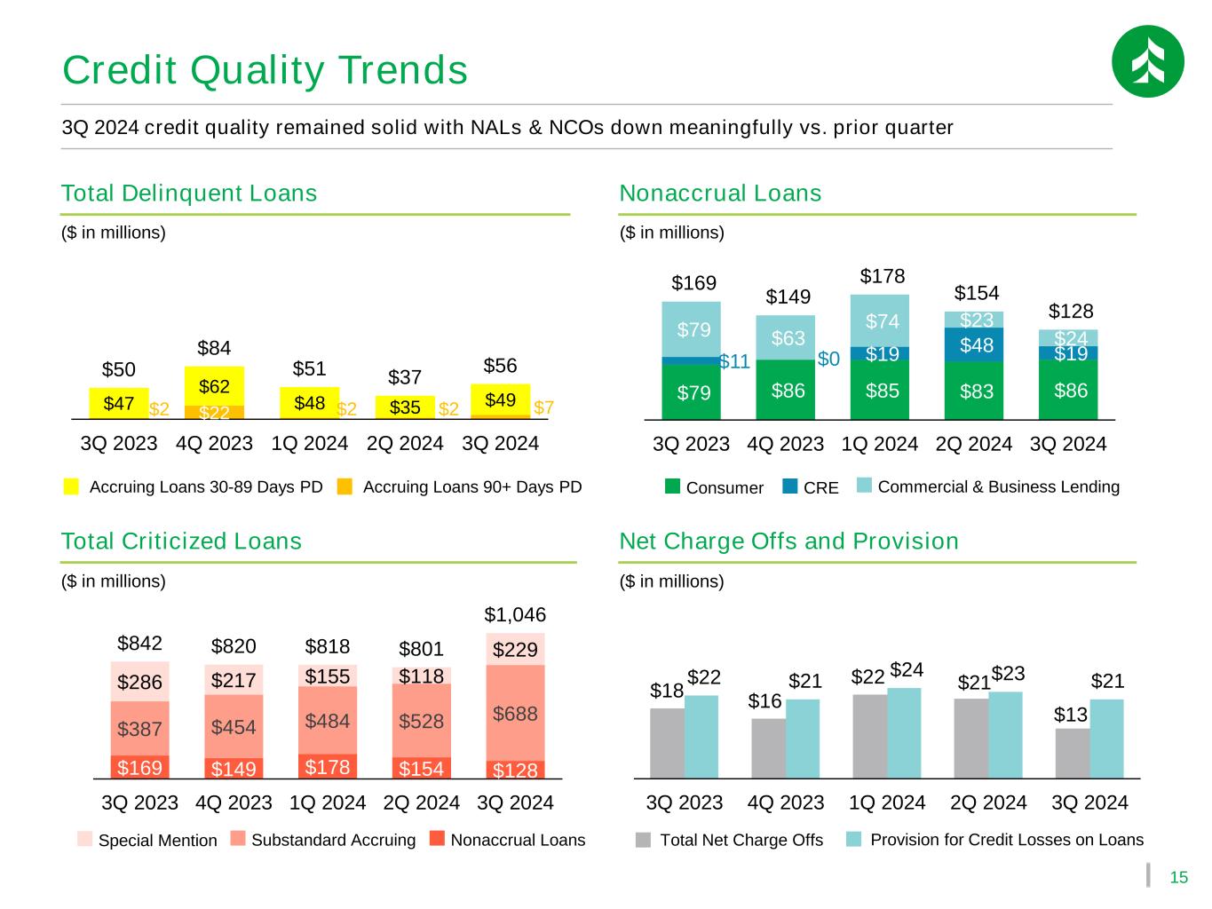 14 ACLL / Total Loans (%)ACLL1 Update ▪ ACLL increased $8 million from the prior quarter to $398 million, driven primarily by nominal credit movement coupled with general macroeconomic trends ▪ CECL forward-looking assumptions based on Moody’s August 2024 Baseline forecast 1 Includes funded and unfunded reserve for loans, excludes reserve for HTM securities. ($ in thousands) Our ACLL percentage increased by 1 basis point vs. the prior quarter to 1.33% Allowance for Credit Losses on Loans (ACLL) Update 1.26 1.32 1.31 1.32 1.33 3Q 2023 4Q 2023 1Q 2024 2Q 2024 3Q 2024 Loan Category ACLL ACLL / Loans ACLL ACLL / Loans ACLL ACLL / Loans C&BL 146,502$ 1.31% 150,274$ 1.36% 143,974$ 1.27% CRE - Investor 68,214 1.31% 72,156 1.44% 78,743 1.55% CRE - Construction 71,317 3.35% 71,680 3.18% 79,136 3.74% Residential Mortgage 40,437 0.46% 34,542 0.44% 34,931 0.45% Other Consumer 54,101 1.86% 60,968 1.77% 60,756 1.68% Total 380,571$ 1.26% 389,620$ 1.32% 397,541$ 1.33% 9/30/20249/30/2023 6/30/2024