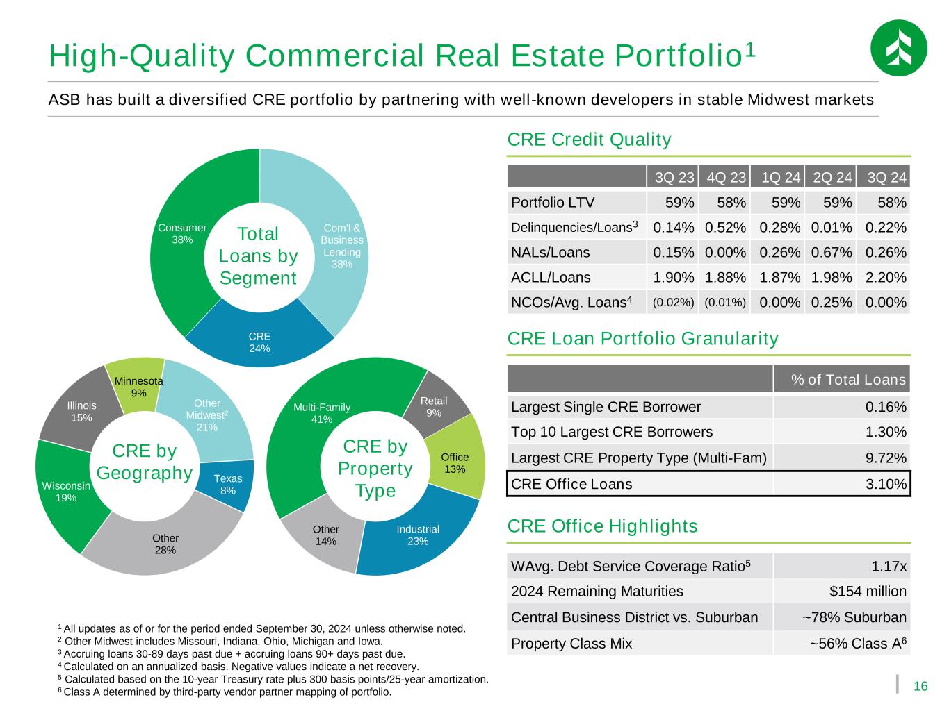 16 Multi-Family 41% Retail 9% Office 13% Industrial 23% Other 14% Consumer 38% Com'l & Business Lending 38% CRE 24% Wisconsin 19% Illinois 15% Minnesota 9% Other Midwest2 21% Texas 8% Other 28% 1 All updates as of or for the period ended September 30, 2024 unless otherwise noted. 2 Other Midwest includes Missouri, Indiana, Ohio, Michigan and Iowa. 3 Accruing loans 30-89 days past due + accruing loans 90+ days past due. 4 Calculated on an annualized basis. Negative values indicate a net recovery. 5 Calculated based on the 10-year Treasury rate plus 300 basis points/25-year amortization. 6 Class A determined by third-party vendor partner mapping of portfolio. High-Quality Commercial Real Estate Portfolio1 ASB has built a diversified CRE portfolio by partnering with well-known developers in stable Midwest markets 3Q 23 4Q 23 1Q 24 2Q 24 3Q 24 Portfolio LTV 59% 58% 59% 59% 58% Delinquencies/Loans3 0.14% 0.52% 0.28% 0.01% 0.22% NALs/Loans 0.15% 0.00% 0.26% 0.67% 0.26% ACLL/Loans 1.90% 1.88% 1.87% 1.98% 2.20% NCOs/Avg. Loans4 (0.02%) (0.01%) 0.00% 0.25% 0.00% CRE Credit Quality CRE Loan Portfolio Granularity % of Total Loans Largest Single CRE Borrower 0.16% Top 10 Largest CRE Borrowers 1.30% Largest CRE Property Type (Multi-Fam) 9.72% CRE Office Loans 3.10% CRE by Geography CRE by Property Type Total Loans by Segment CRE Office Highlights WAvg. Debt Service Coverage Ratio5 1.17x 2024 Remaining Maturities $154 million Central Business District vs. Suburban ~78% Suburban Property Class Mix ~56% Class A6