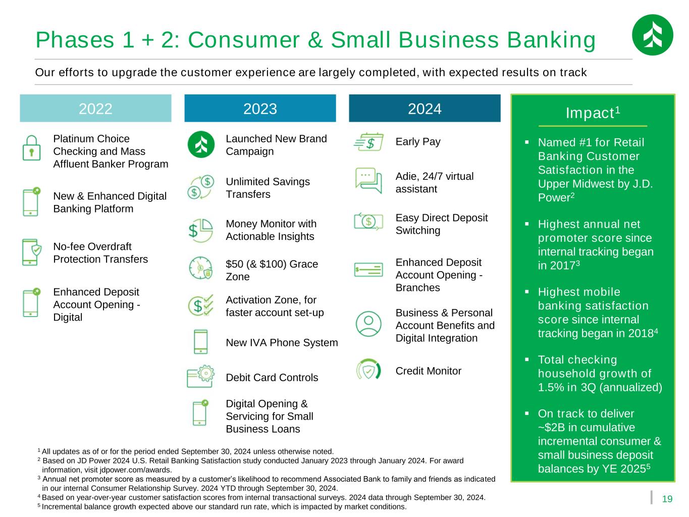 4 Tailwinds into 20251 Progress against several key performance indicators has positioned us for growth in 2025 Driving Net Household Growth ▪ Total checking household growth of 1.5% in 3Q (annualized) ▪ Improved quality of households ▪ +13% in YTD deposit balances per new consumer checking household vs. 2023 (1-3)% 0% 1.5% 3% 2016-2022 2023 2024 (est.) 2025 (est.) Customer Checking Household Growth Improving Customer Satisfaction ▪ Highest annual net promoter score since internal tracking began in 20172 ▪ Highest mobile banking satisfaction score since internal tracking began in 20183 ▪ Ranked #1 for Retail Banking Customer Satisfaction in the Upper Midwest by J.D. Power4 Expanding our Commercial Presence ▪ Added 16 net commercial & business RMs from 9/30/23 to 10/23/24 ▪ On track with our Phase 2 plan to add 26 Commercial & Business RMs by early 2025 39 42 42 51 2021 2022 2023 2024 YTD Net Promoter Score 94 110 ~120 9/30/2023 10/23/2024 2025 (est.) Commercial & Business RM FTE 1 All updates as of or for the period ended September 30, 2024 unless otherwise noted. 2 Annual net promoter score as measured by a customer’s likelihood to recommend Associated Bank to family and friends as indicated in our internal Consumer Relationship Survey. 2024 YTD through September 30, 2024. 3 Based on year-over-year customer satisfaction scores from internal transactional surveys. 2024 data through September 30, 2024. 4 Based on JD Power 2024 U.S. Retail Banking Satisfaction study conducted January 2023 through January 2024. For award information, visit jdpower.com/awards.