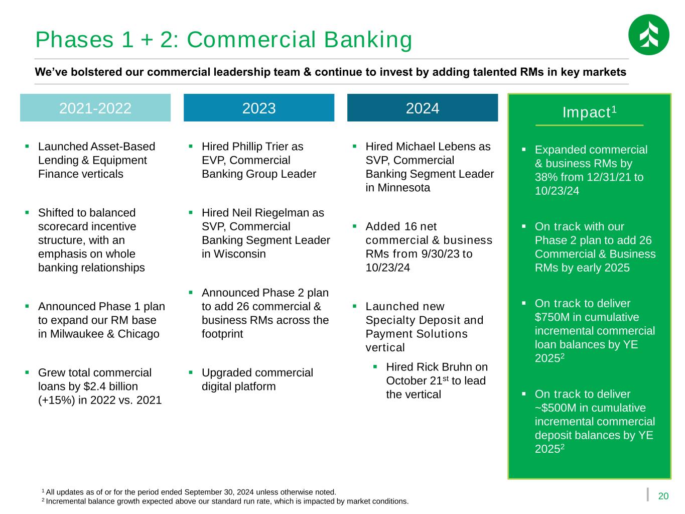 19 Phases 1 + 2: Consumer & Small Business Banking Our efforts to upgrade the customer experience are largely completed, with expected results on track 2022 2023 2024 ▪ Highest mobile banking satisfaction score since internal tracking began in 20184 ▪ Total checking household growth of 1.5% in 3Q (annualized) ▪ On track to deliver ~$2B in cumulative incremental consumer & small business deposit balances by YE 20255 ▪ Highest annual net promoter score since internal tracking began in 20173 1 All updates as of or for the period ended September 30, 2024 unless otherwise noted. 2 Based on JD Power 2024 U.S. Retail Banking Satisfaction study conducted January 2023 through January 2024. For award information, visit jdpower.com/awards. 3 Annual net promoter score as measured by a customer’s likelihood to recommend Associated Bank to family and friends as indicated in our internal Consumer Relationship Survey. 2024 YTD through September 30, 2024. 4 Based on year-over-year customer satisfaction scores from internal transactional surveys. 2024 data through September 30, 2024. 5 Incremental balance growth expected above our standard run rate, which is impacted by market conditions. Launched New Brand Campaign Platinum Choice Checking and Mass Affluent Banker Program New & Enhanced Digital Banking Platform No-fee Overdraft Protection Transfers Enhanced Deposit Account Opening - Digital Unlimited Savings Transfers Money Monitor with Actionable Insights $50 (& $100) Grace Zone Activation Zone, for faster account set-up New IVA Phone System Debit Card Controls Digital Opening & Servicing for Small Business Loans Early Pay Adie, 24/7 virtual assistant Easy Direct Deposit Switching Enhanced Deposit Account Opening - Branches Business & Personal Account Benefits and Digital Integration Credit Monitor Impact1 ▪ Named #1 for Retail Banking Customer Satisfaction in the Upper Midwest by J.D. Power2
