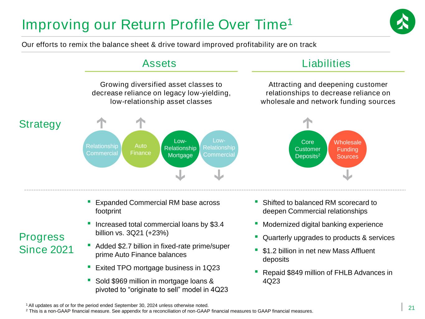 20 Phases 1 + 2: Commercial Banking We’ve bolstered our commercial leadership team & continue to invest by adding talented RMs in key markets 2021-2022 2023 2024 ▪ Launched Asset-Based Lending & Equipment Finance verticals ▪ Shifted to balanced scorecard incentive structure, with an emphasis on whole banking relationships ▪ Announced Phase 1 plan to expand our RM base in Milwaukee & Chicago ▪ Grew total commercial loans by $2.4 billion (+15%) in 2022 vs. 2021 1 All updates as of or for the period ended September 30, 2024 unless otherwise noted. 2 Incremental balance growth expected above our standard run rate, which is impacted by market conditions. ▪ Hired Phillip Trier as EVP, Commercial Banking Group Leader ▪ Hired Neil Riegelman as SVP, Commercial Banking Segment Leader in Wisconsin ▪ Announced Phase 2 plan to add 26 commercial & business RMs across the footprint ▪ Upgraded commercial digital platform ▪ Hired Michael Lebens as SVP, Commercial Banking Segment Leader in Minnesota ▪ Added 16 net commercial & business RMs from 9/30/23 to 10/23/24 ▪ Launched new Specialty Deposit and Payment Solutions vertical ▪ Hired Rick Bruhn on October 21st to lead the vertical ▪ On track to deliver $750M in cumulative incremental commercial loan balances by YE 20252 ▪ On track to deliver ~$500M in cumulative incremental commercial deposit balances by YE 20252 ▪ On track with our Phase 2 plan to add 26 Commercial & Business RMs by early 2025 Impact1 ▪ Expanded commercial & business RMs by 38% from 12/31/21 to 10/23/24