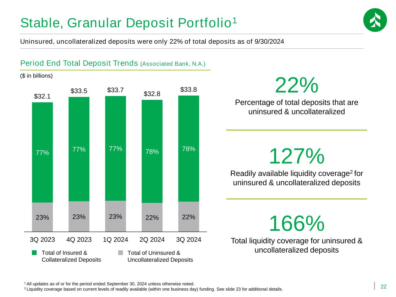 22 Stable, Granular Deposit Portfolio1 Uninsured, uncollateralized deposits were only 22% of total deposits as of 9/30/2024 1 All updates as of or for the period ended September 30, 2024 unless otherwise noted. 2 Liquidity coverage based on current levels of readily available (within one business day) funding. See slide 23 for additional details. 23% 23% 23% 22% 22% 77% 77% 77% 78% 78% $32.1 $33.5 $33.7 $32.8 $33.8 3Q 2023 4Q 2023 1Q 2024 2Q 2024 3Q 2024 Period End Total Deposit Trends (Associated Bank, N.A.) ($ in billions) Total of Insured & Collateralized Deposits Total of Uninsured & Uncollateralized Deposits 22% Percentage of total deposits that are uninsured & uncollateralized 127% Readily available liquidity coverage2 for uninsured & uncollateralized deposits 166% Total liquidity coverage for uninsured & uncollateralized deposits