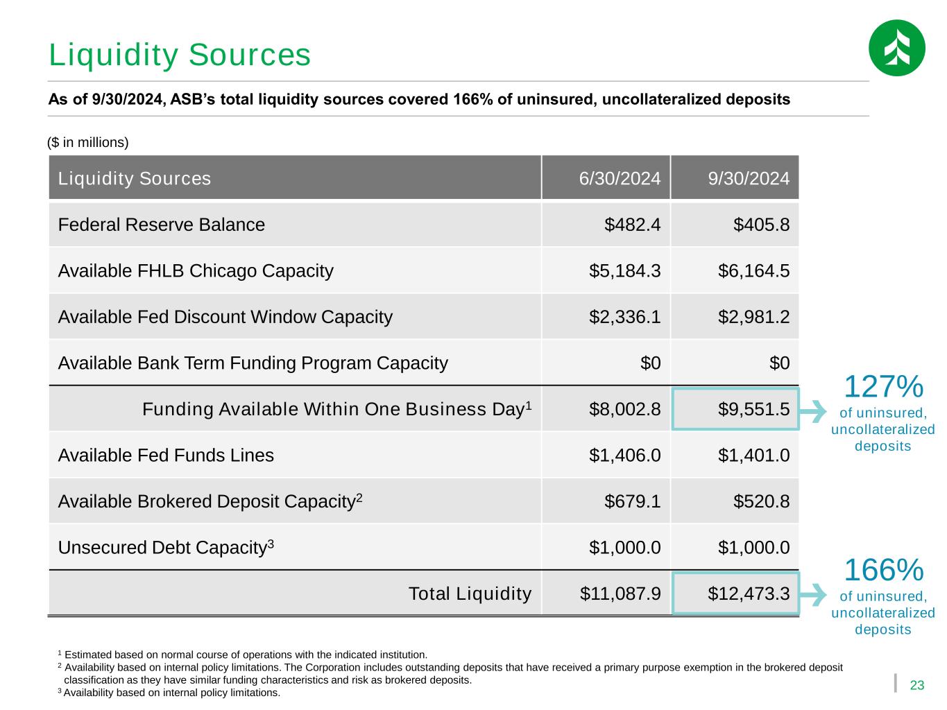 23 Liquidity Sources As of 9/30/2024, ASB’s total liquidity sources covered 166% of uninsured, uncollateralized deposits Liquidity Sources 6/30/2024 9/30/2024 Federal Reserve Balance $482.4 $405.8 Available FHLB Chicago Capacity $5,184.3 $6,164.5 Available Fed Discount Window Capacity $2,336.1 $2,981.2 Available Bank Term Funding Program Capacity $0 $0 Funding Available Within One Business Day1 $8,002.8 $9,551.5 Available Fed Funds Lines $1,406.0 $1,401.0 Available Brokered Deposit Capacity2 $679.1 $520.8 Unsecured Debt Capacity3 $1,000.0 $1,000.0 Total Liquidity $11,087.9 $12,473.3 ($ in millions) 127% of uninsured, uncollateralized deposits 166% of uninsured, uncollateralized deposits 1 Estimated based on normal course of operations with the indicated institution. 2 Availability based on internal policy limitations. The Corporation includes outstanding deposits that have received a primary purpose exemption in the brokered deposit classification as they have similar funding characteristics and risk as brokered deposits. 3 Availability based on internal policy limitations.