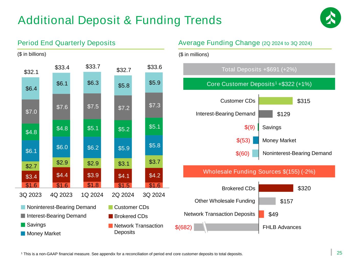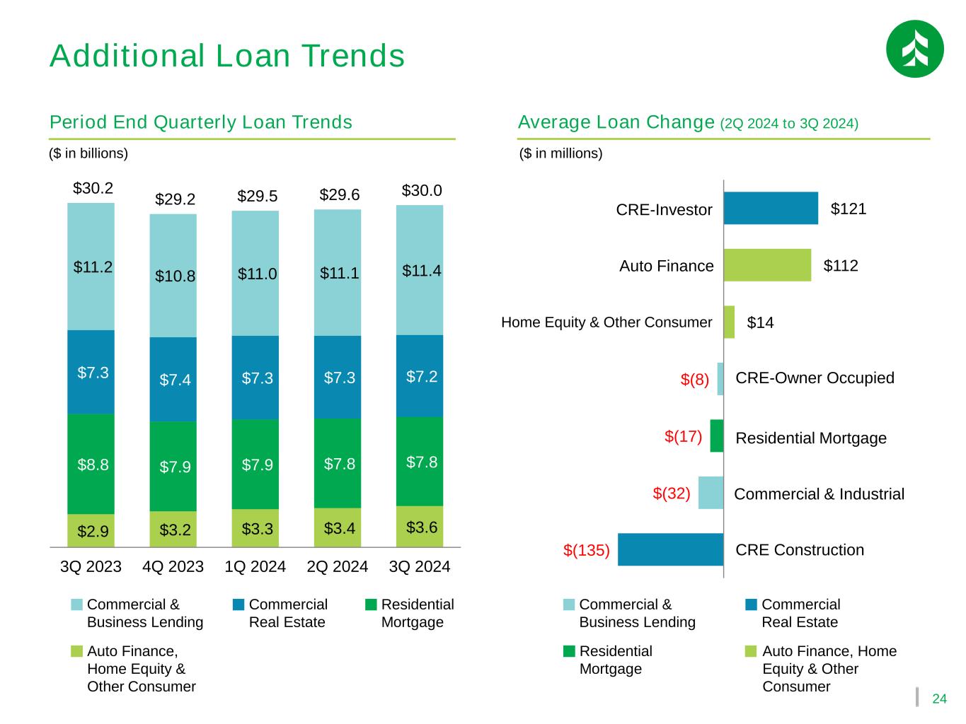 24 $2.9 $3.2 $3.3 $3.4 $3.6 $8.8 $7.9 $7.9 $7.8 $7.8 $7.3 $7.4 $7.3 $7.3 $7.2 $11.2 $10.8 $11.0 $11.1 $11.4 $30.2 $29.2 $29.5 $29.6 $30.0 3Q 2023 4Q 2023 1Q 2024 2Q 2024 3Q 2024 ($ in billions) Commercial & Business Lending Commercial Real Estate Residential Mortgage Auto Finance, Home Equity & Other Consumer ($ in millions) Average Loan Change (2Q 2024 to 3Q 2024)Period End Quarterly Loan Trends $(135) $(32) $(17) $(8) $14 $112 $121 Residential Mortgage CRE-Investor Commercial & Industrial Home Equity & Other Consumer Auto Finance CRE Construction CRE-Owner Occupied Additional Loan Trends Commercial & Business Lending Commercial Real Estate Residential Mortgage Auto Finance, Home Equity & Other Consumer