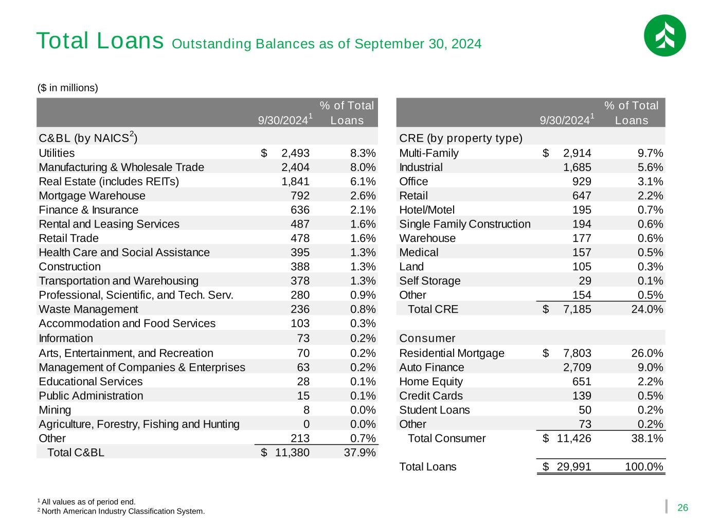 25 Period End Quarterly Deposits ($ in billions) Average Funding Change (2Q 2024 to 3Q 2024) ($ in millions) $1.6 $1.6 $1.8 $1.5 $1.6 $3.4 $4.4 $3.9 $4.1 $4.2 $2.7 $2.9 $2.9 $3.1 $3.7 $6.1 $6.0 $6.2 $5.9 $5.8 $4.8 $4.8 $5.1 $5.2 $5.1 $7.0 $7.6 $7.5 $7.2 $7.3 $6.4 $6.1 $6.3 $5.8 $5.9 $32.1 $33.4 $33.7 $32.7 $33.6 3Q 2023 4Q 2023 1Q 2024 2Q 2024 3Q 2024 Customer CDs Savings Money Market Network Transaction Deposits Noninterest-Bearing Demand Interest-Bearing Demand Brokered CDs 1 This is a non-GAAP financial measure. See appendix for a reconciliation of period end core customer deposits to total deposits. $(60) $(53) $(9) $129 $315 Money Market Noninterest-Bearing Demand Interest-Bearing Demand $49 $157 $320 Brokered CDs FHLB Advances Core Customer Deposits1 +$322 (+1%) Wholesale Funding Sources $(155) (-2%) Total Deposits +$691 (+2%) Savings Customer CDs $(682) Other Wholesale Funding Additional Deposit & Funding Trends Network Transaction Deposits
